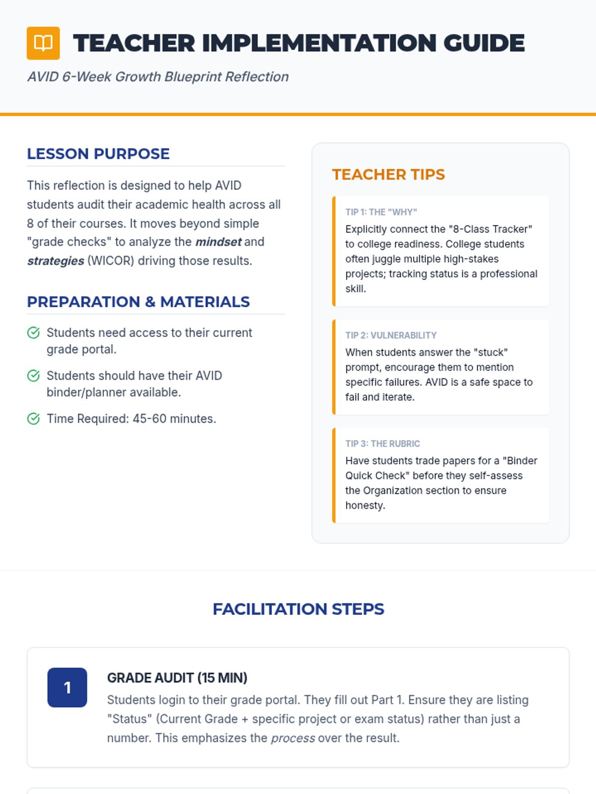 A teacher's guide for implementing the AVID 6-week reflection, including facilitation steps, grading rubrics, and instructional tips for high school CTE educators.