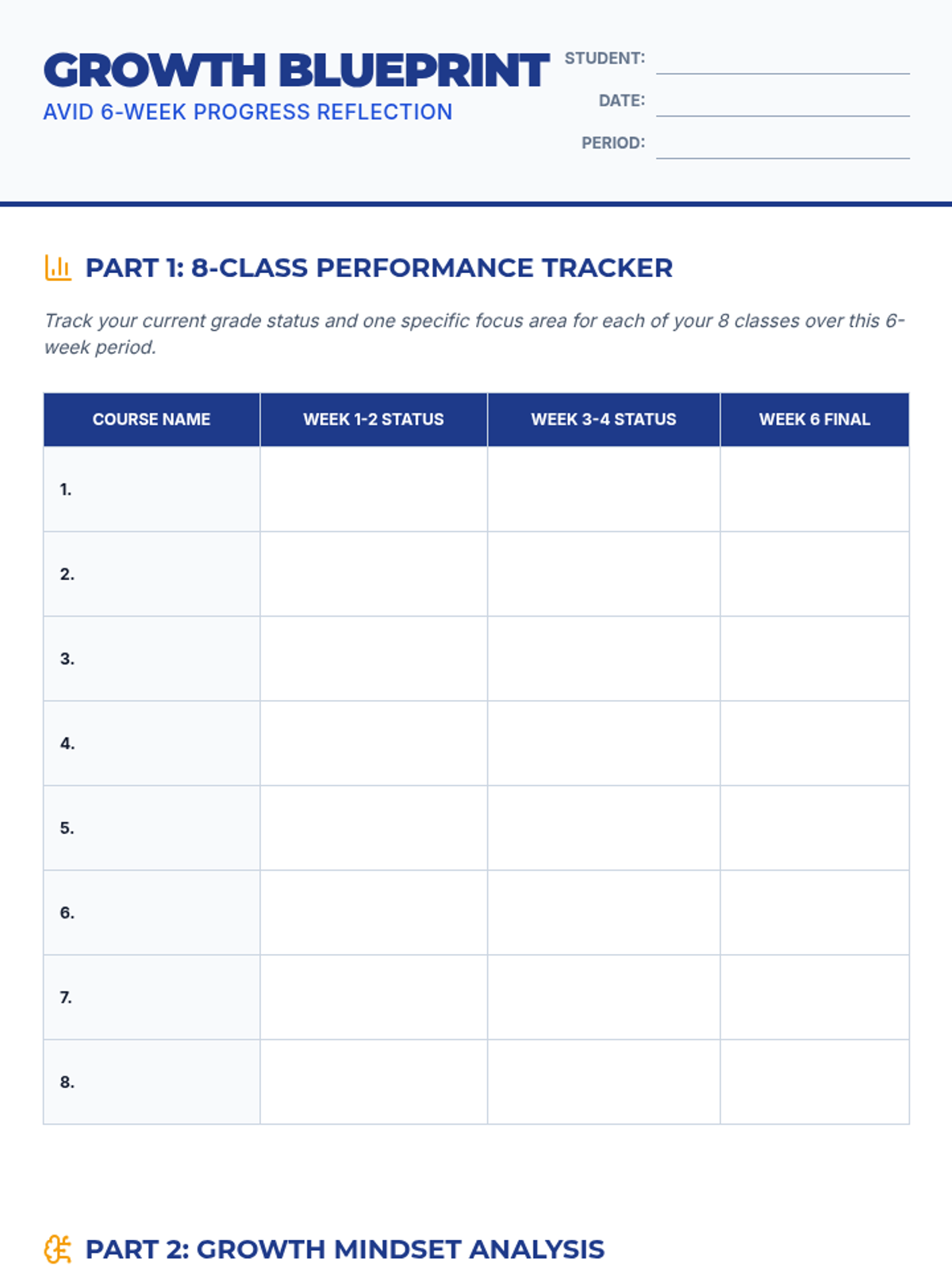A comprehensive 3-page 6-week reflection document for high school AVID students, featuring an 8-class progress log, growth mindset writing prompts, and a detailed WICOR self-assessment rubric.