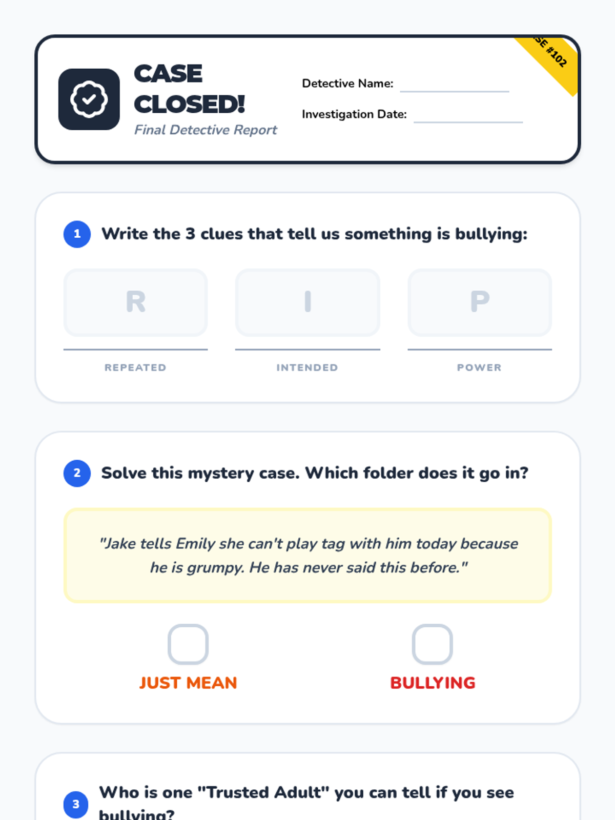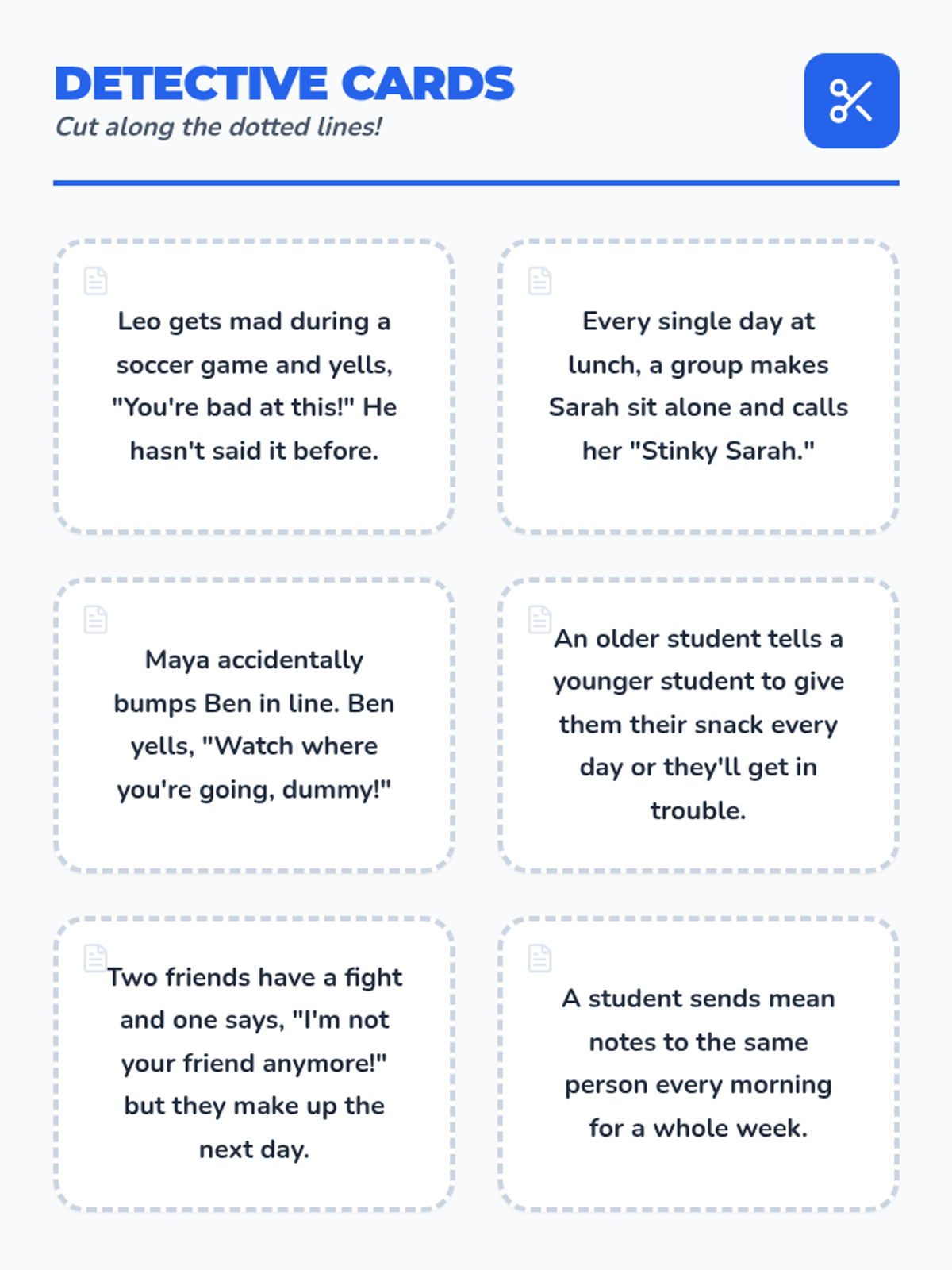 A printable sorting game where students cut out scenario cards and place them into 'Just Mean' or 'Bullying' categories. Includes large evidence folders for gluing.