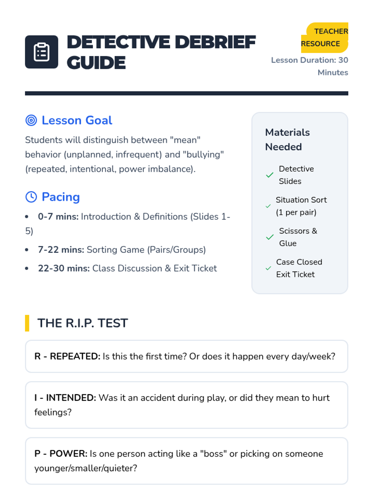 A teacher guide for the 30-minute lesson, featuring pacing, materials, the 'RIP' test explanation, game answer key, and debriefing questions. High-contrast labels for teacher use.