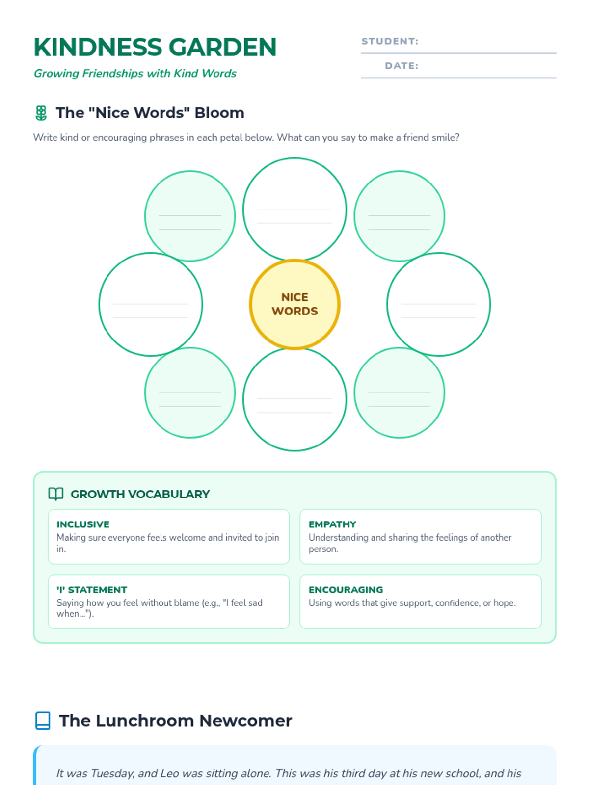 A revised reading and response worksheet focusing on kindness, 'I' statements, and inclusion. Fixed layout issues with the graphic organizer and page breaks for a cleaner student experience.