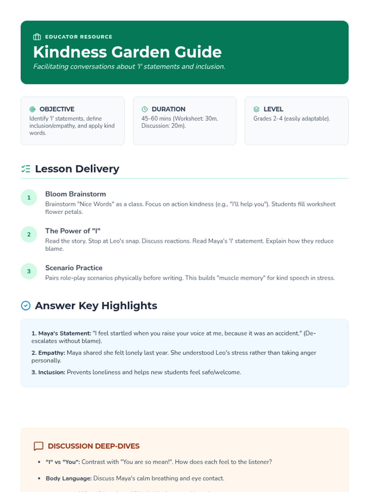 A teacher's guide for the Kindness Garden lesson, including lesson objectives, delivery steps, a detailed answer key for the student worksheet, and discussion prompts for deepening social-emotional learning.