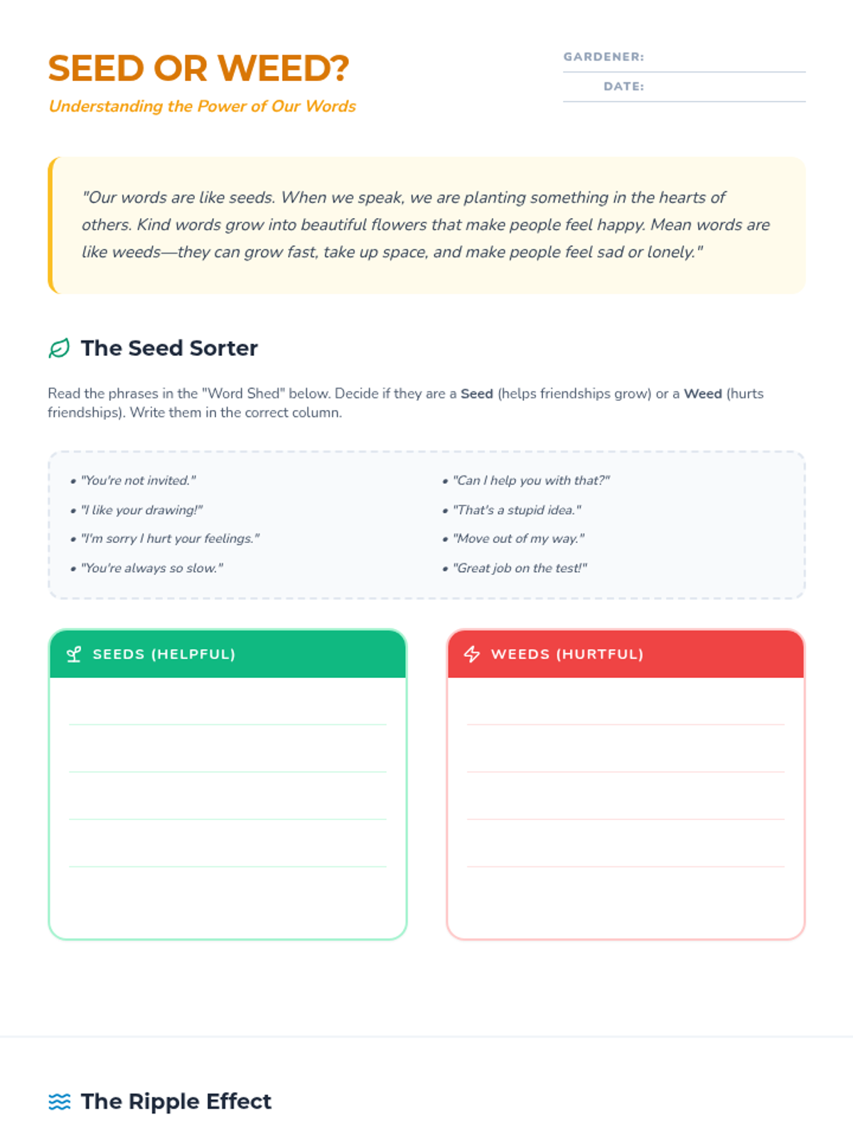 A revised version of the Seed or Weed worksheet that now includes a themed reading passage about a gardener named Sam and a final paragraph writing task where students reflect on the importance of using kind words to build healthy relationships.