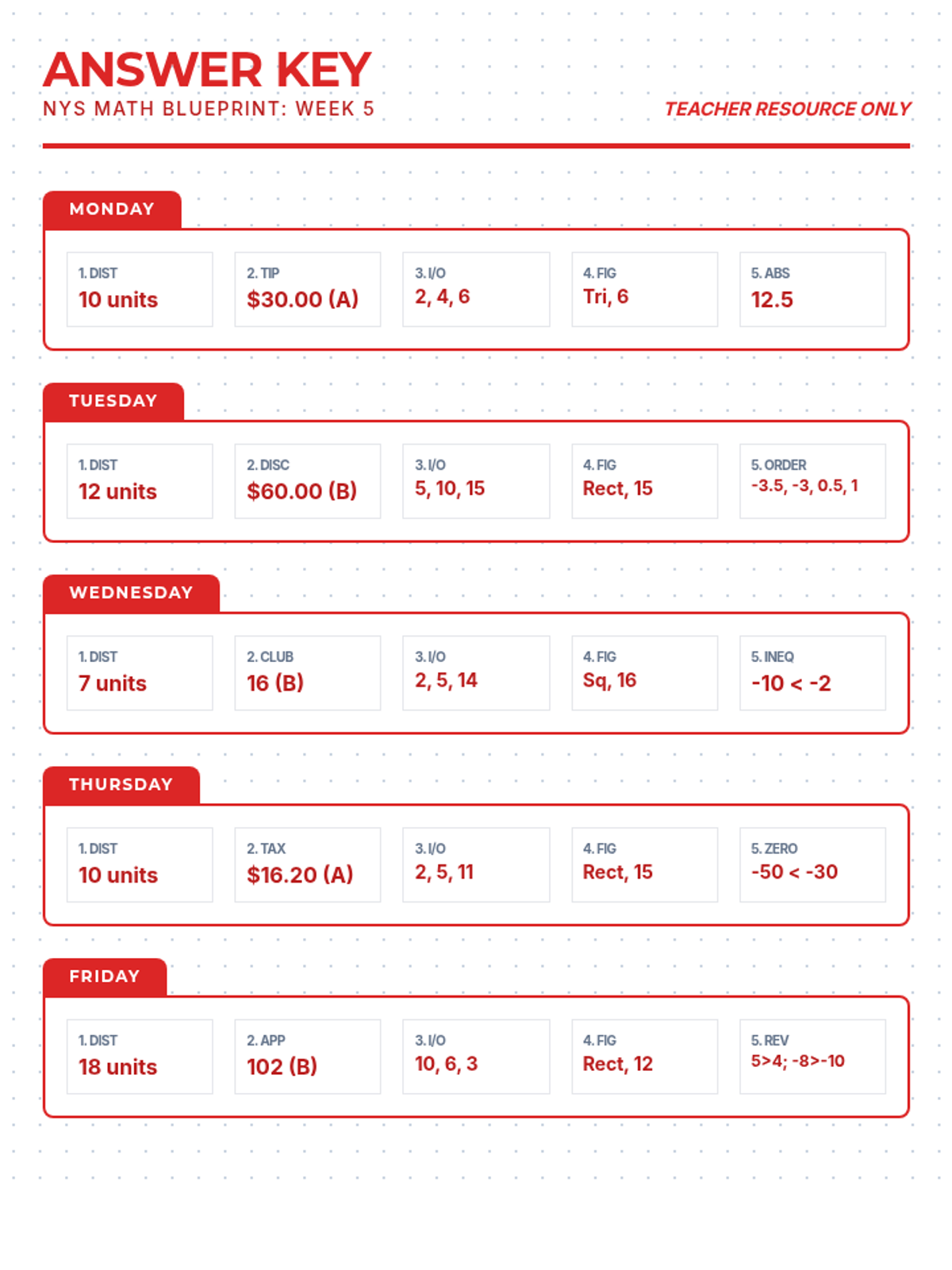 Teacher answer key for Week 5 Math Blueprint spiral review. All 5 days (Monday-Friday) included.