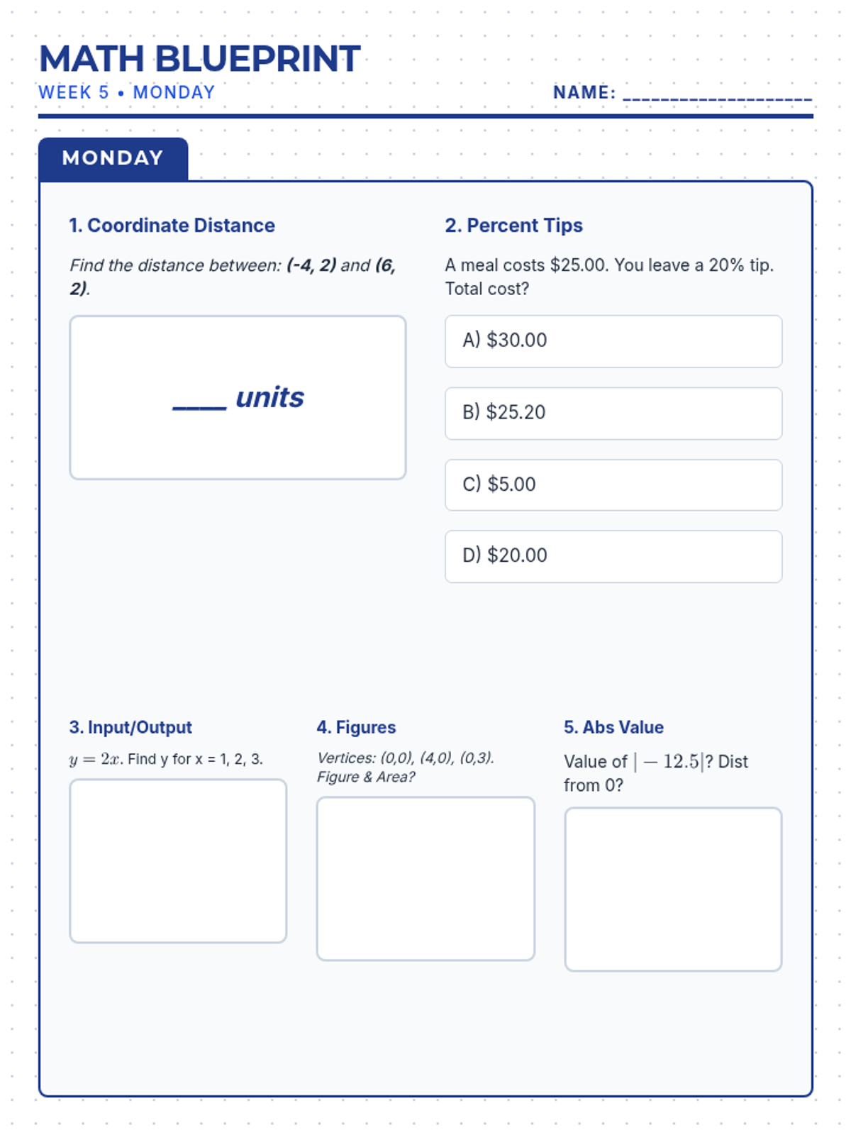 Final 5-day student booklet for Week 5 math review. Aligned with NYS standards. Each day is a single page.