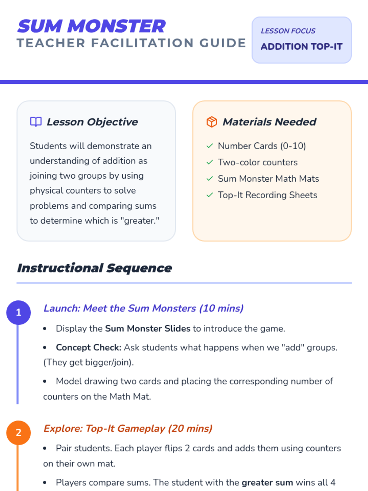 A comprehensive teacher guide for facilitating the Addition Top-It game, including step-by-step instructions, discussion prompts, and differentiation strategies for kindergarten learners.