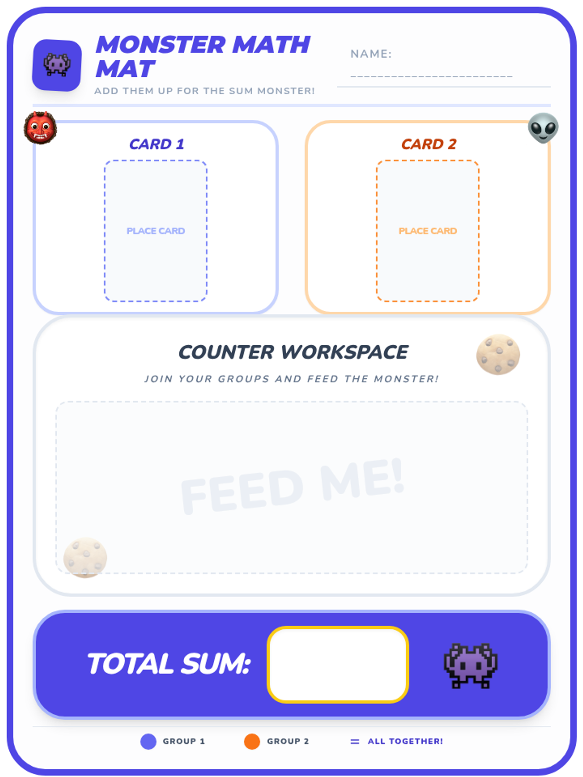 A printable math mat for students to organize their cards and counters during Top-It gameplay, featuring designated zones for two cards and a large counter workspace.