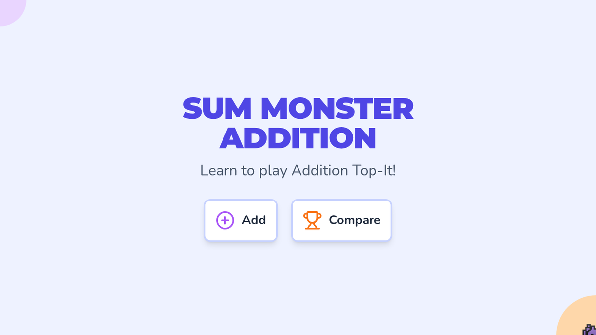 A vibrant slide deck introducing the Top-It addition game to kindergarteners, featuring friendly 'Sum Monsters' and clear visual steps for using counters to add and compare numbers.