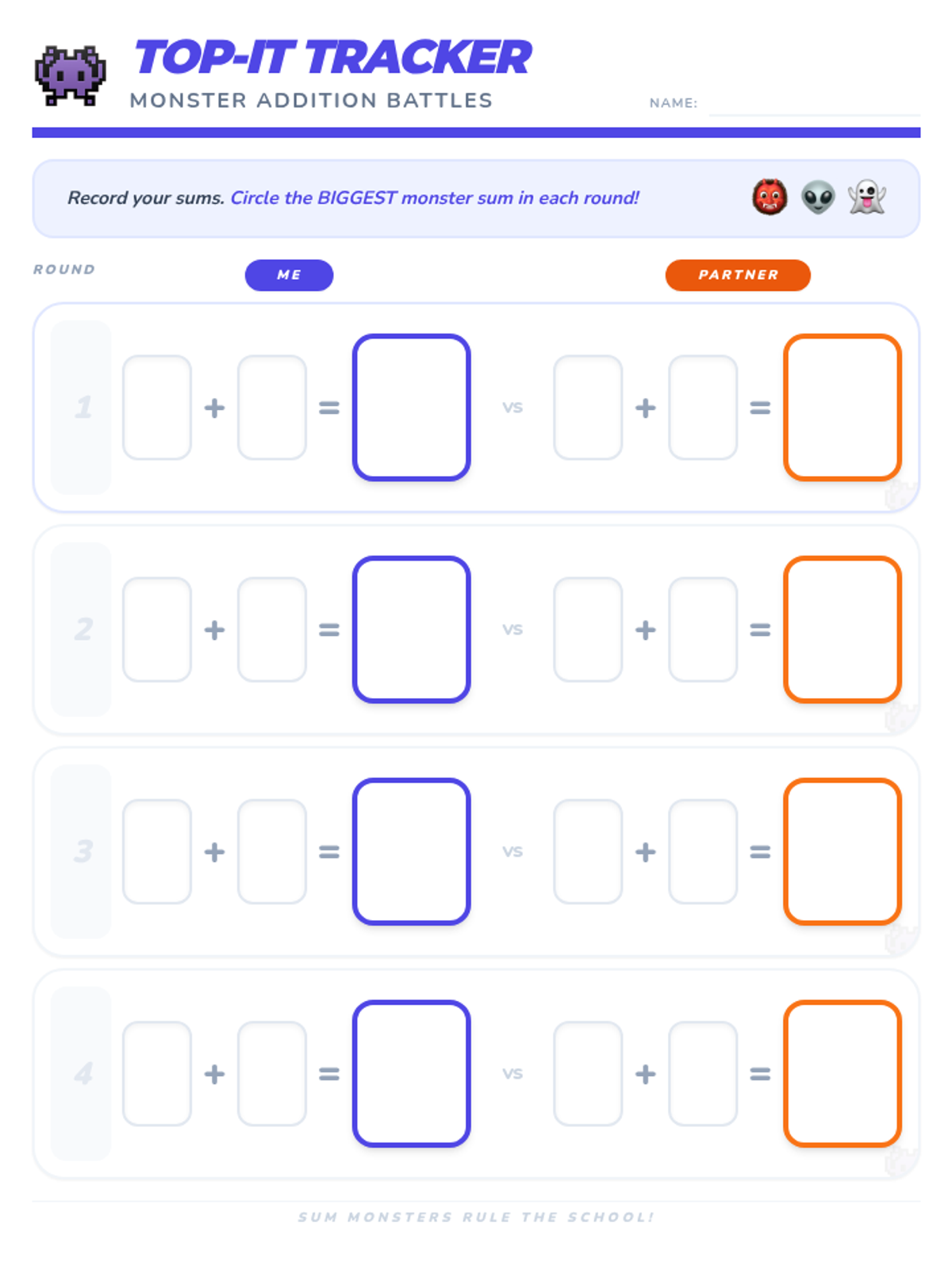 A student recording sheet for the Top-It addition game, redesigned to allow two players to record and compare their sums on a single page.