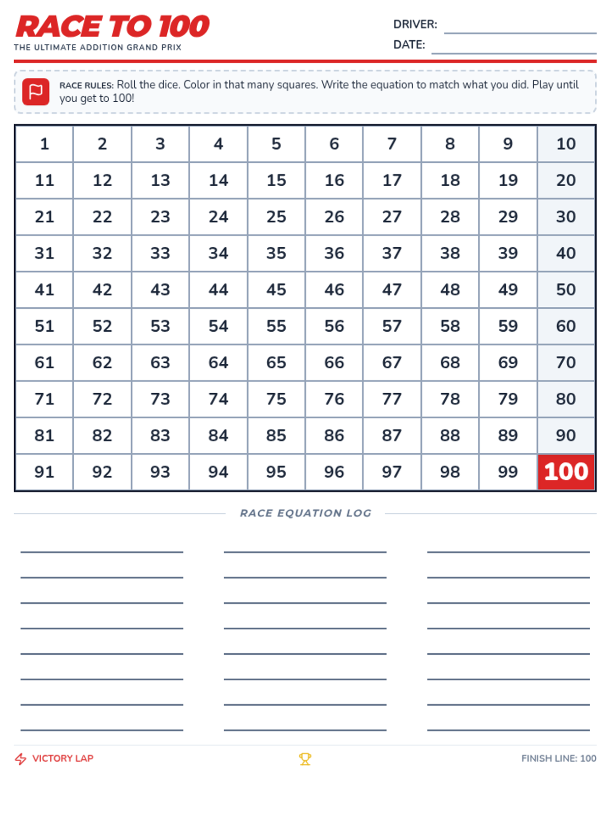 A racing-themed 'Race to 100' game board with a maximized 100 chart and ultra-slim 0.15-inch margins. This version features high-contrast numbers and darkened grid lines (slate-400) and equation lines (slate-500) to ensure high-quality printing and photocopying.