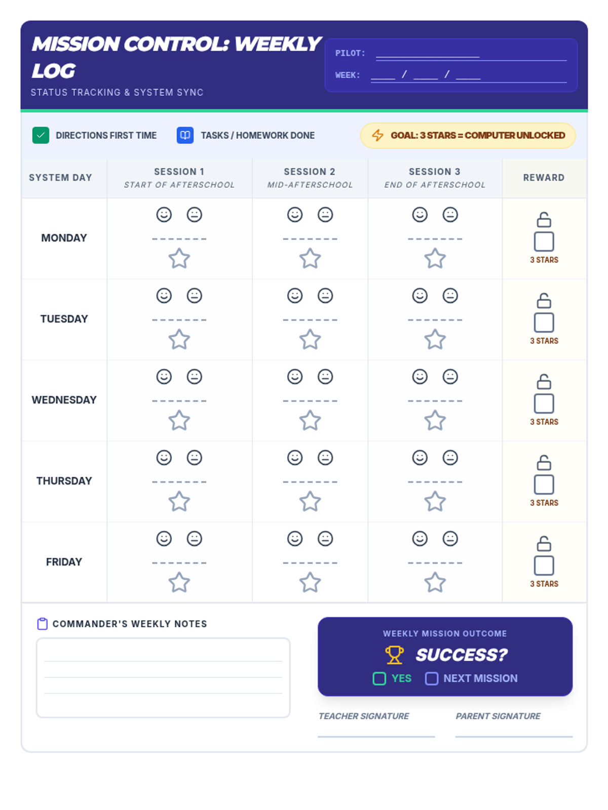 A consolidated 1-page weekly behavior tracker for a 4th-grade student, using a Mission Control theme to monitor directions and homework across Monday-Friday, specifically for an afterschool schedule.
