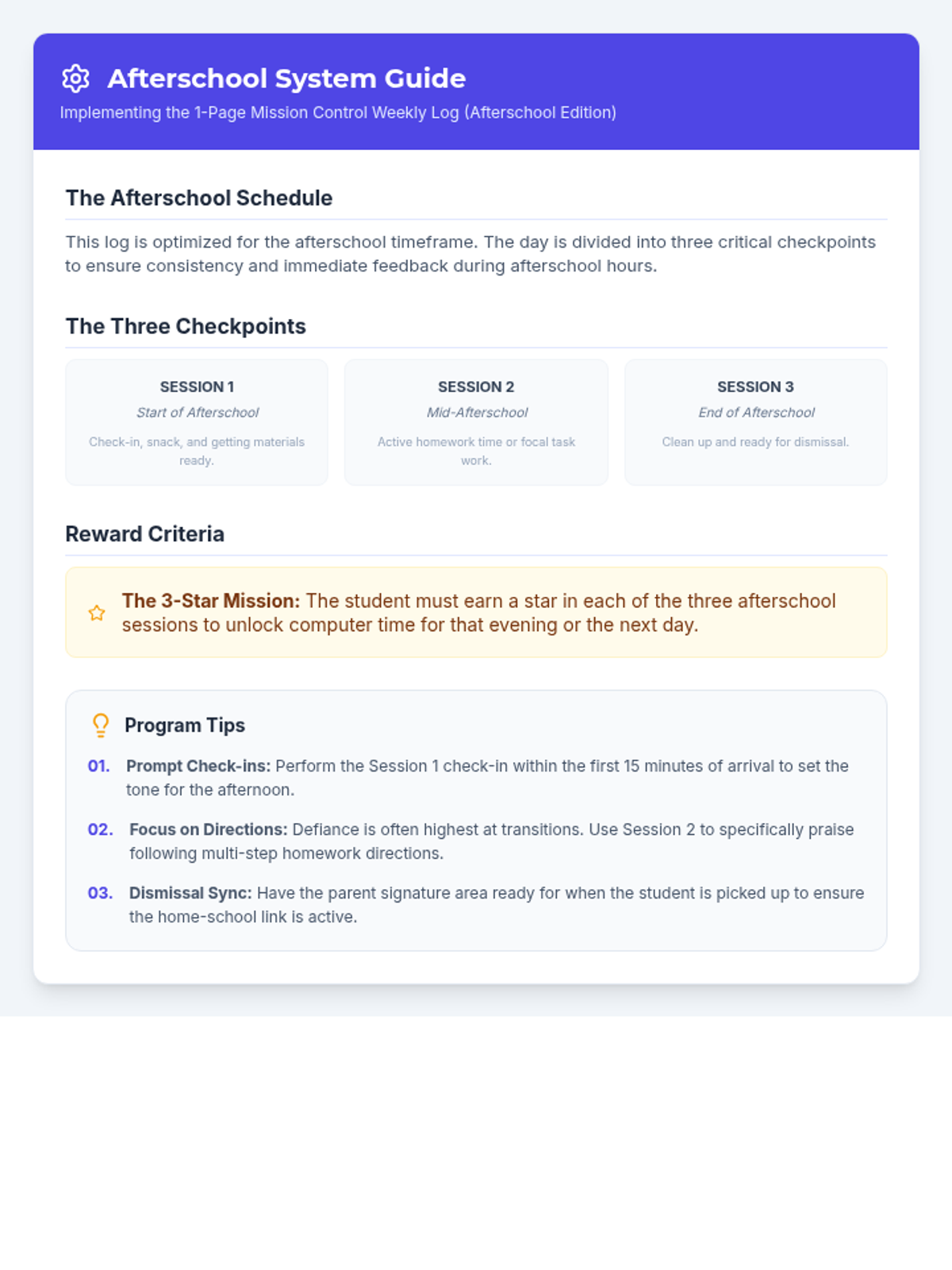 Teacher guide for the 1-page consolidated weekly behavior log, detailing session scoring and reward tracking for afterschool programs.