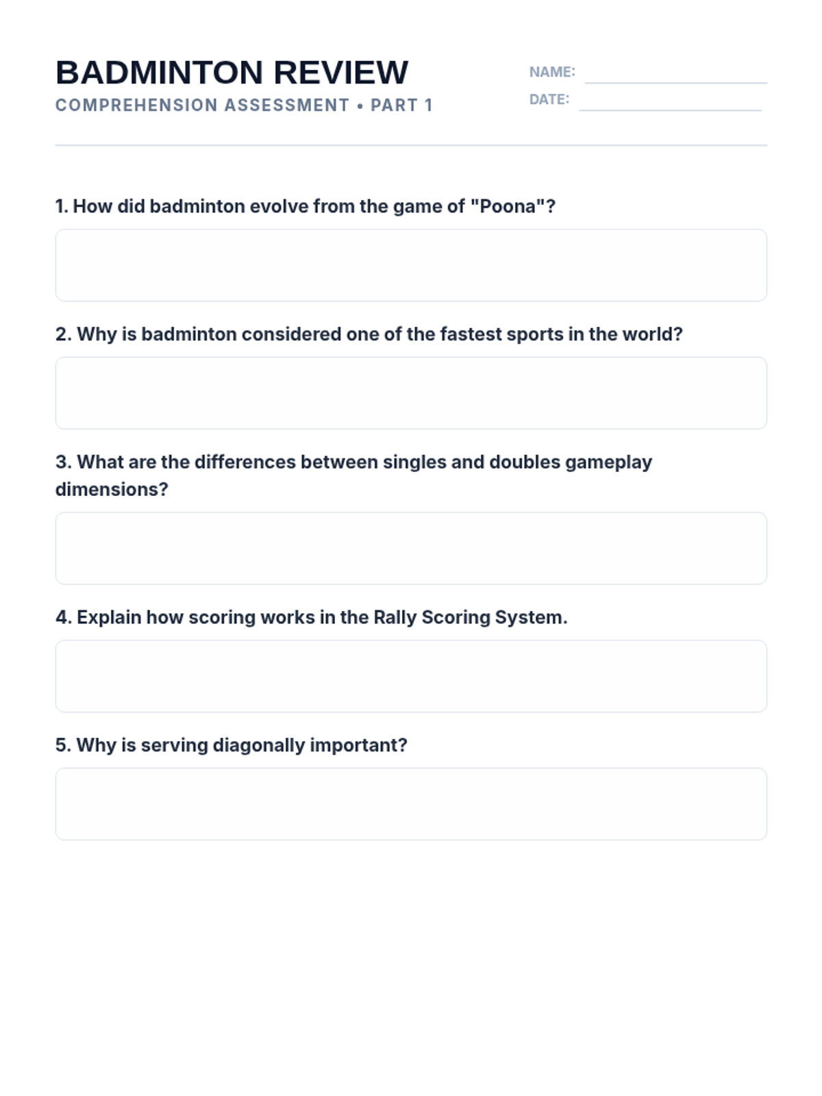 A consolidated student activity packet for the badminton unit. It contains open-ended comprehension questions across two pages with uniform writing space, followed by a properly formatted 1-page crossword puzzle. Features consistent headers and ink-friendly design for flawless PDF alignment.