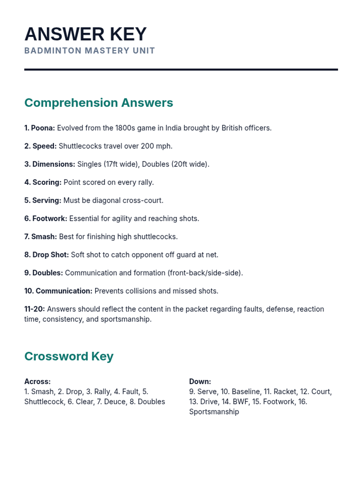 A concise answer key for the badminton unit comprehension questions and crossword puzzle.
