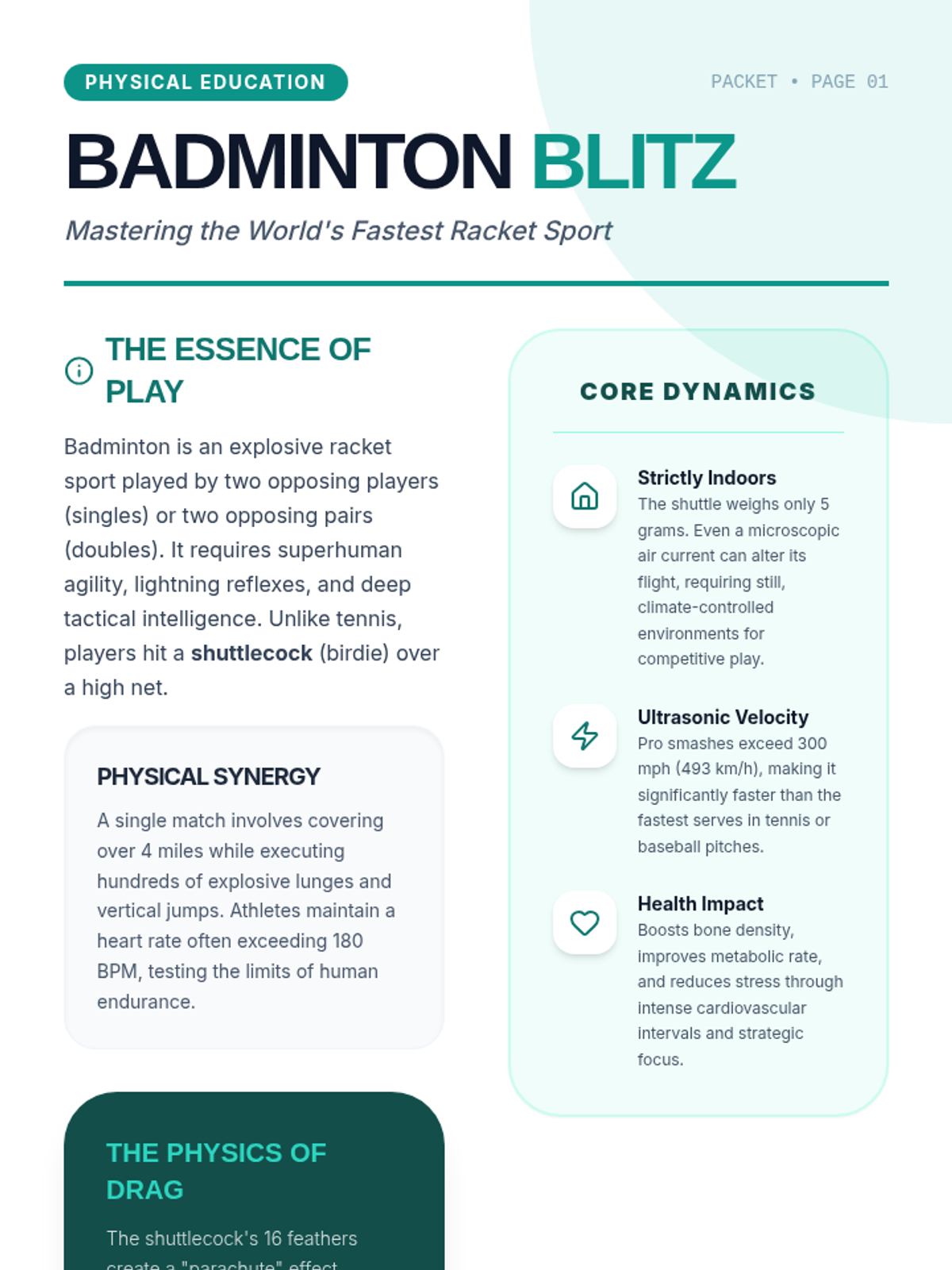 A professional, high-density 5-page informational packet for badminton. Consolidates content to eliminate empty space while expanding technical details on physics, gear, and strategy. Features improved court diagrams and consistent headers for flawless PDF alignment.