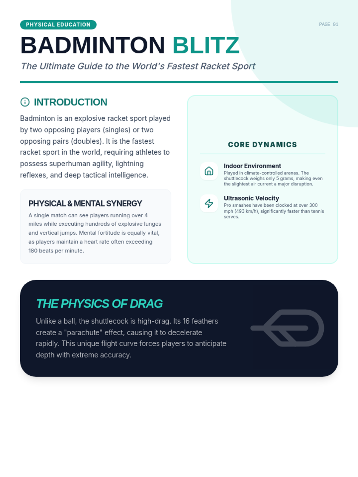 A professional, high-density 5-page informational packet for badminton. Consolidates content to eliminate empty space while expanding technical details on physics, gear, and strategy. Features improved court diagrams and consistent headers for flawless PDF alignment. Space and headers improved for alignment.