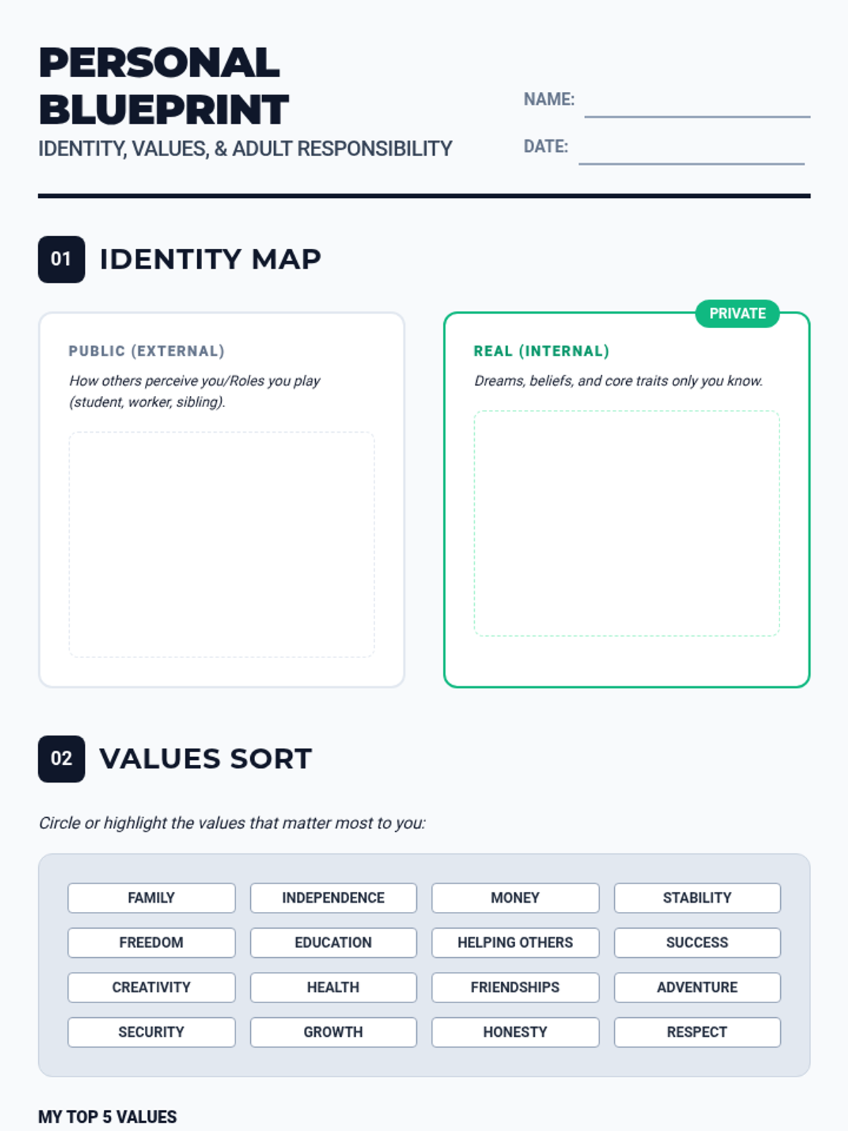 A comprehensive worksheet incorporating value sorting, responsibility audits, consequence analysis, and future-self reflection. Revised to improve contrast and work area visibility. Now features better page-break logic and expanded work areas.