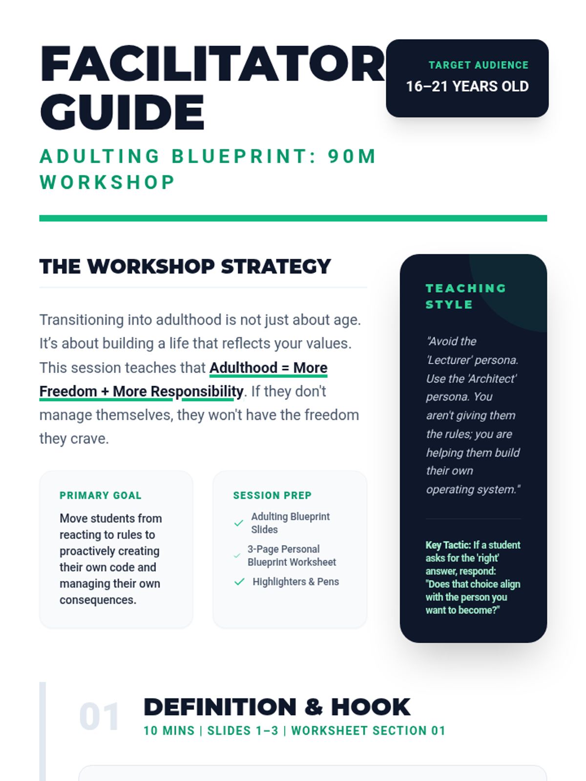 A 90-minute facilitation guide for the Adulting Blueprint session, incorporating new content on the value-habit chain, responsibility consequences, and future-self messaging. Includes clear pacing and discussion prompts.