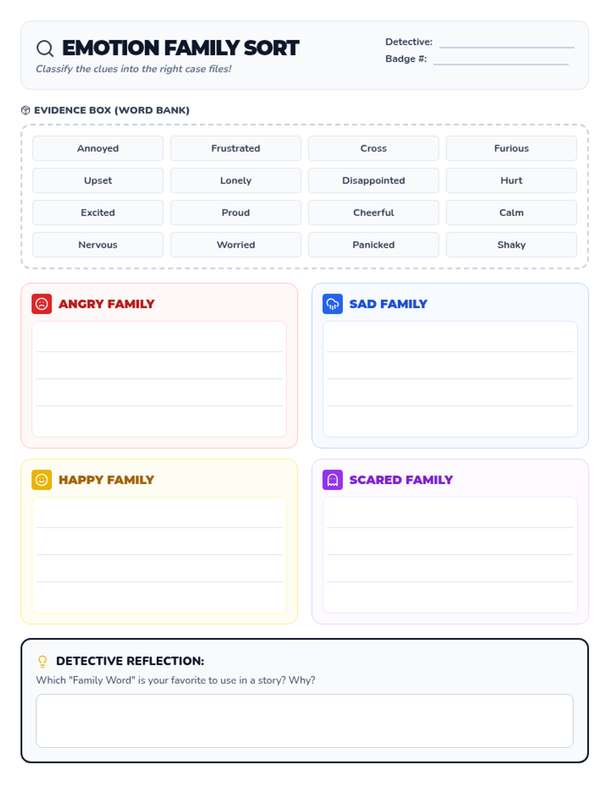 A sorting activity where students categorize nuanced emotion words into four primary emotion families: Angry, Sad, Happy, and Scared. Revised for single-page layout and improved handwriting areas.