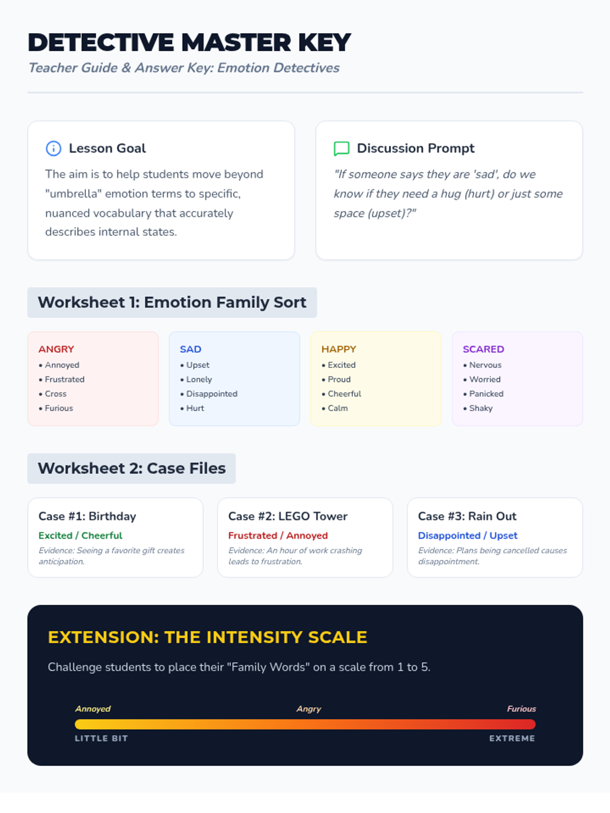 Teacher-facing resource containing the answer key and extension ideas. Revised for improved page layout and visual alignment of the intensity scale.