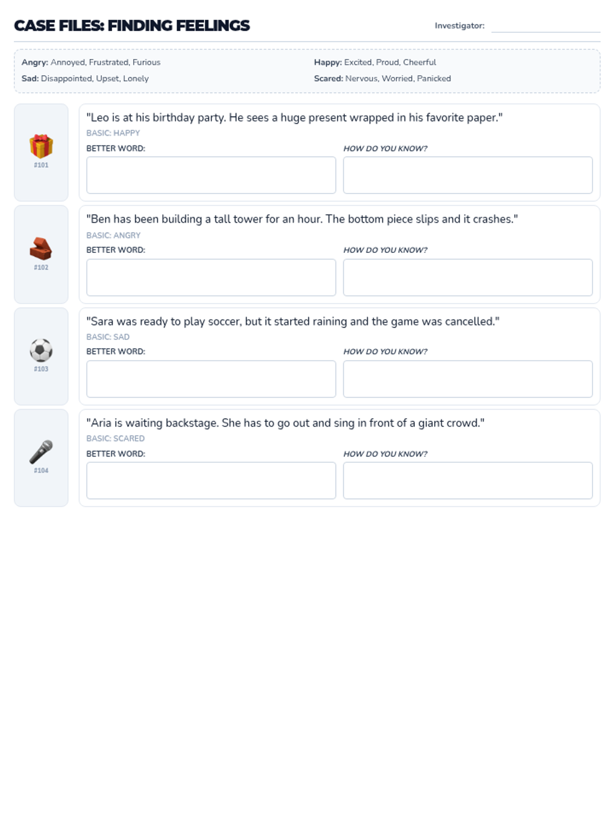 A scenario-based worksheet for P3 students to replace basic emotion words with nuanced vocabulary. Revised with word bank scaffolding and improved layout to fit four cases on a single page.