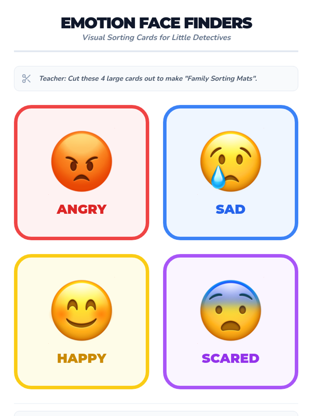 Visual sorting cards and puppet stick templates for Early Years students to identify and categorize emotion families without needing to read or write. Revised with neutral borders and appropriate emojis.
