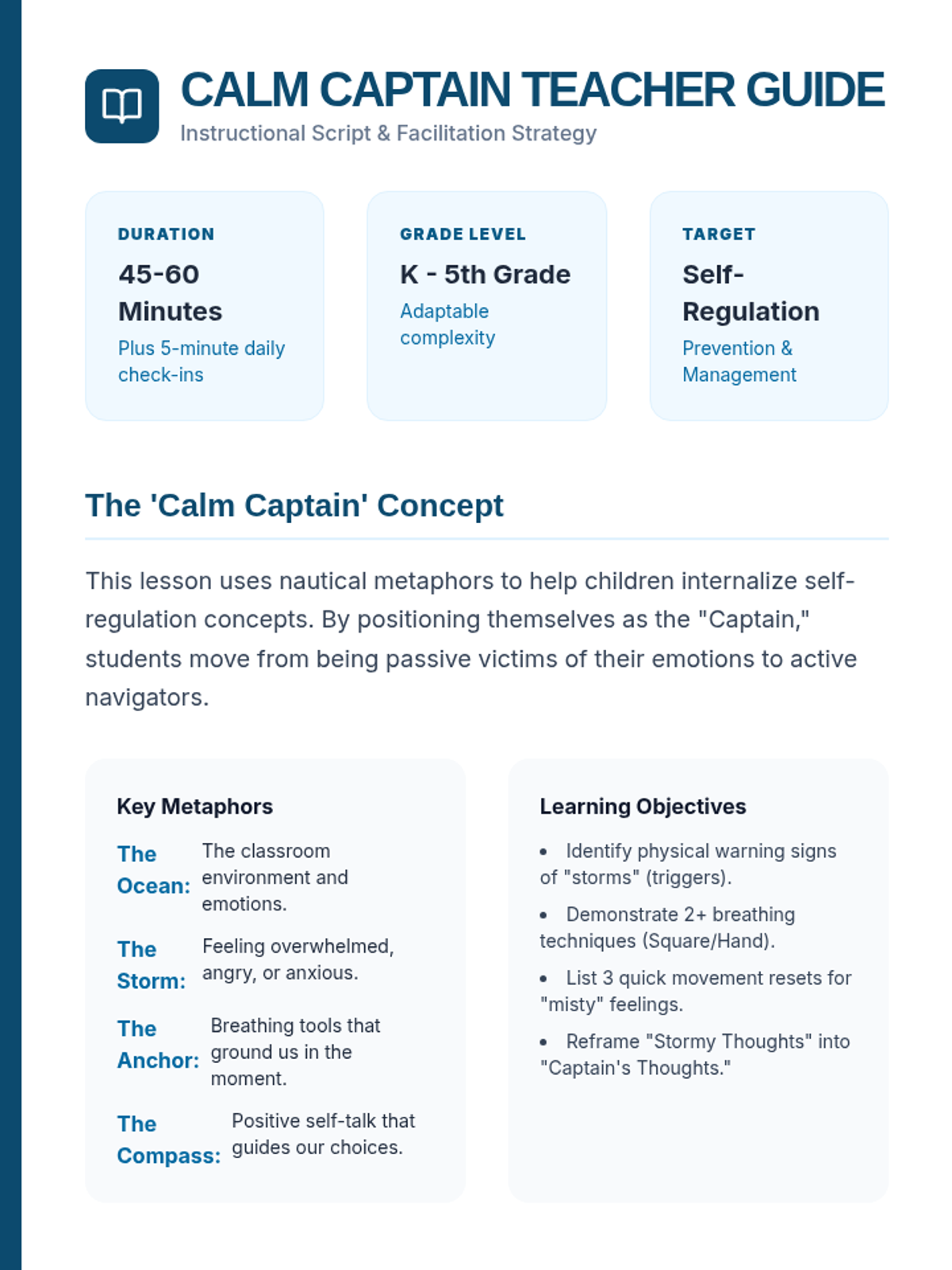 A 3-page teacher guide for the 'Calm Captain' lesson. It includes the lesson's conceptual framework, a detailed delivery script, facilitation tips for activities, and long-term implementation strategies for the classroom.