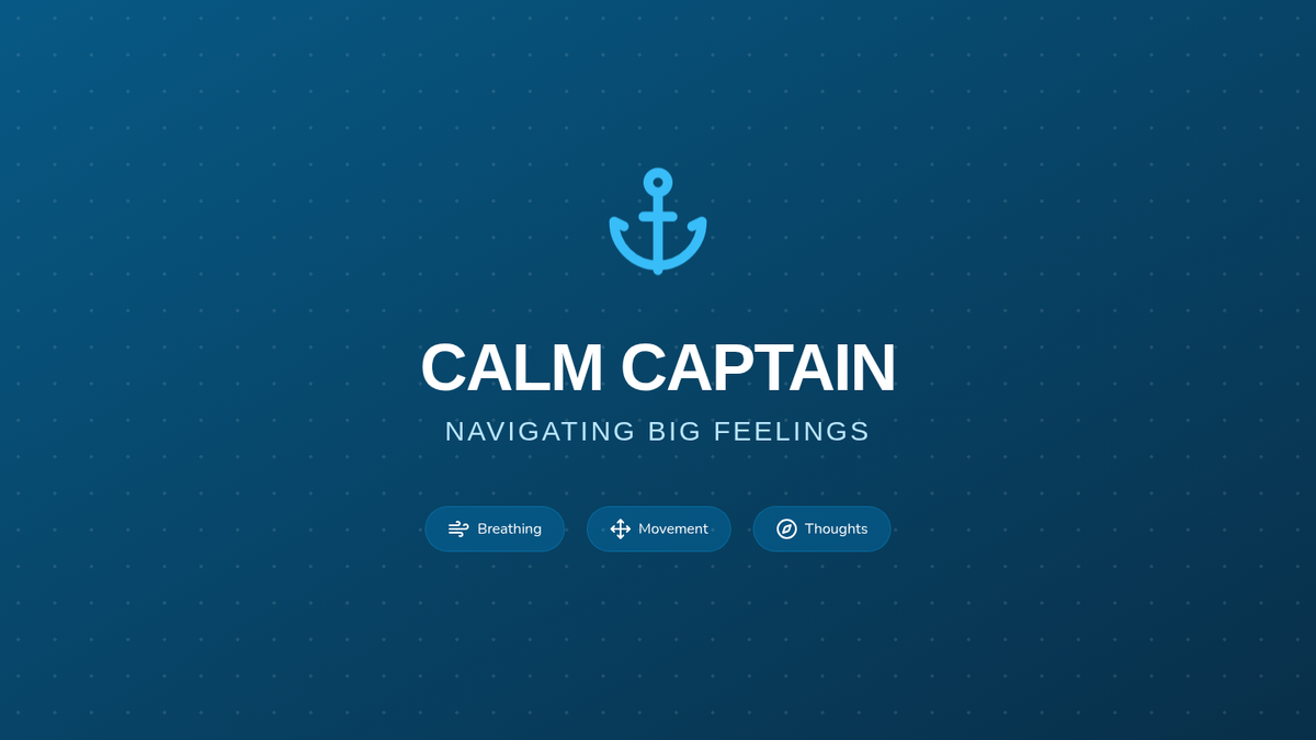 An 8-slide instructional presentation for the 'Calm Captain' lesson. It introduces emotional self-regulation through nautical metaphors, covering triggers, breathing (the anchor), movement (quick resets), and positive self-talk (the compass).