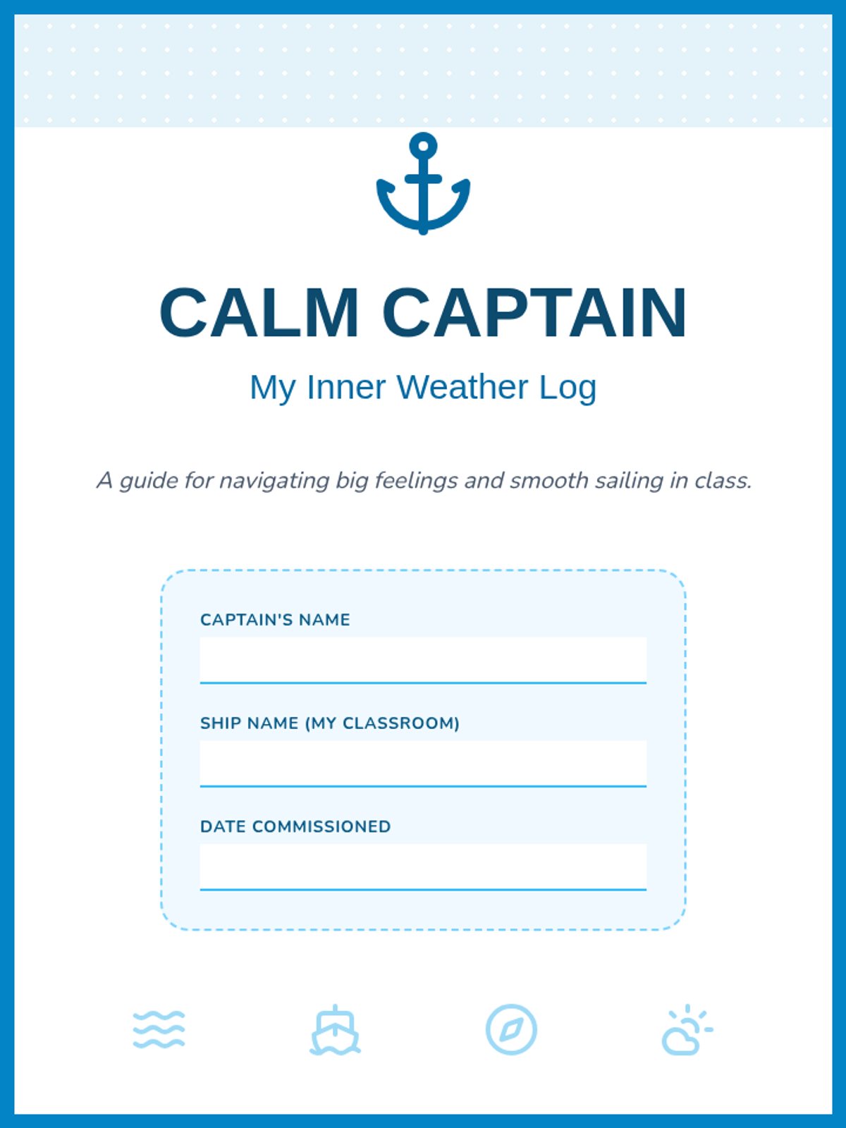 A 6-page student reflection journal and workbook using a nautical 'Calm Captain' theme. It includes activities for identifying emotional triggers, practicing breathing techniques (anchor), movement resets, and positive self-talk strategies.
