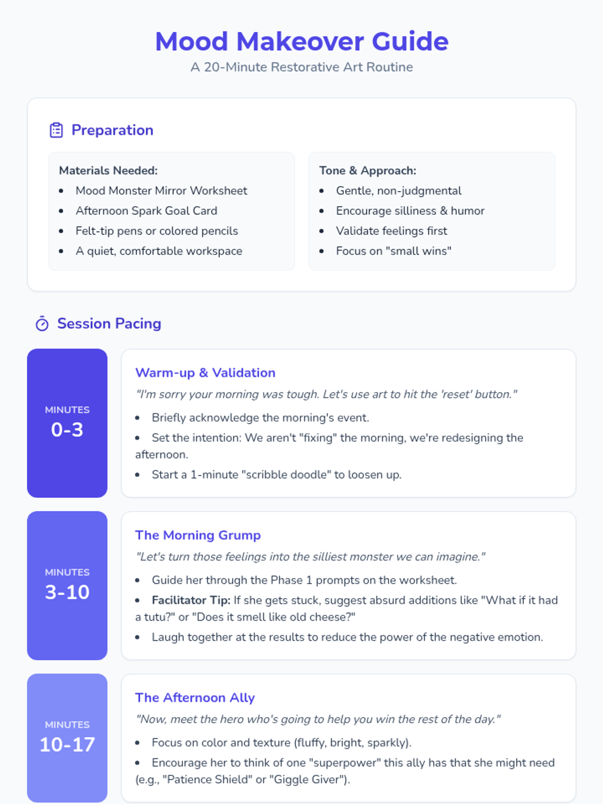A facilitator guide for a 20-minute restorative art session, providing pacing, dialogue prompts, and practical tips for leading a student through mood reflection and goal setting.