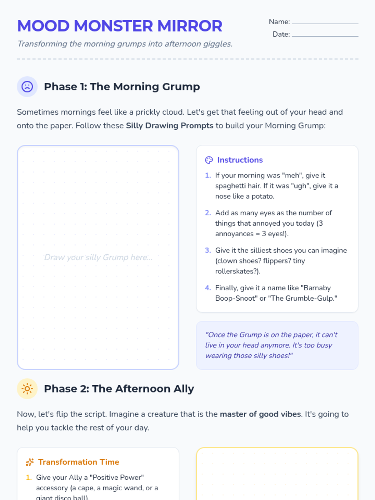 A two-page worksheet featuring guided drawing prompts to help a student externalize a bad morning as a silly monster and transform it into a positive 'Afternoon Ally'. Includes structured drawing areas and creative prompts.