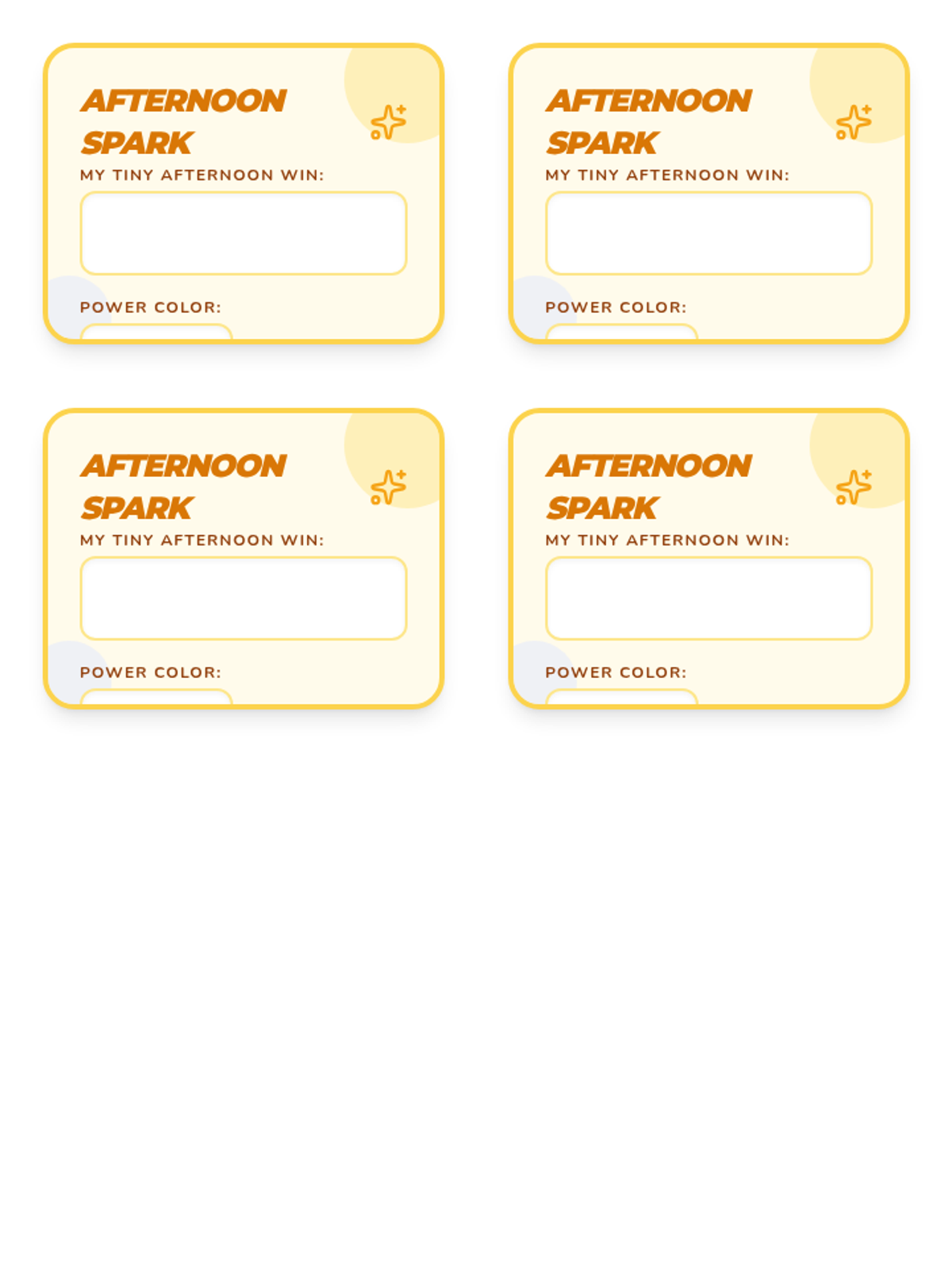 A set of four pocket-sized 'Afternoon Spark' goal cards. Designed for students to carry with them, these cards feature spaces for a small goal ('Tiny Win') and a representative 'Power Color' to remind them of their positive intentions.