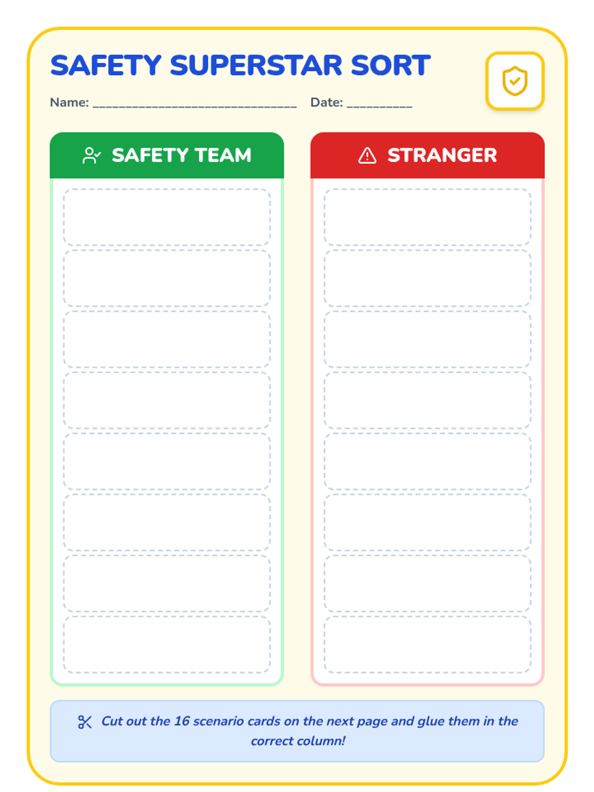 A two-page cut-and-paste activity for kindergarteners to practice distinguishing between trusted adults and potentially unsafe stranger scenarios. Includes 10 clear, illustrated scenarios for sorting.