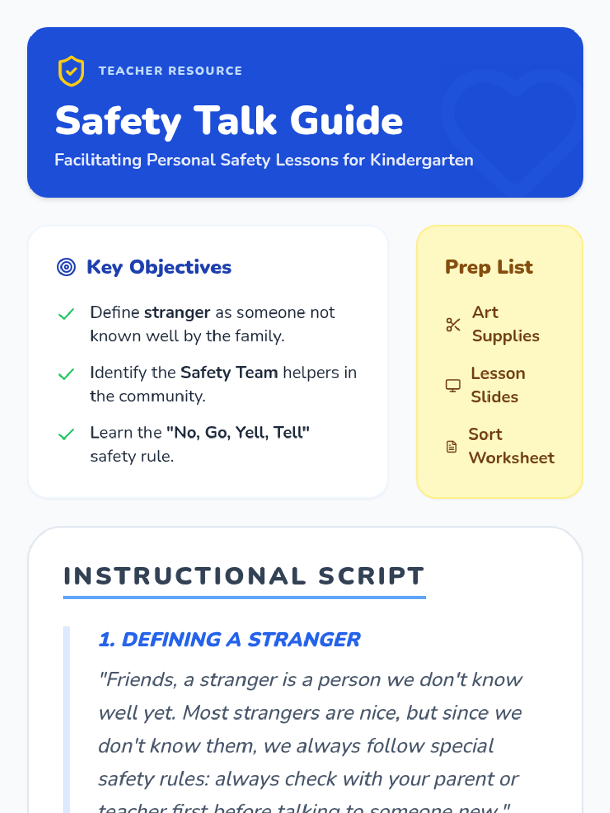 A comprehensive teacher guide for facilitating the Safety Shield lesson. Includes learning objectives, detailed discussion points for Trusted Adults and Safe Strangers, and a structured physical drill activity.