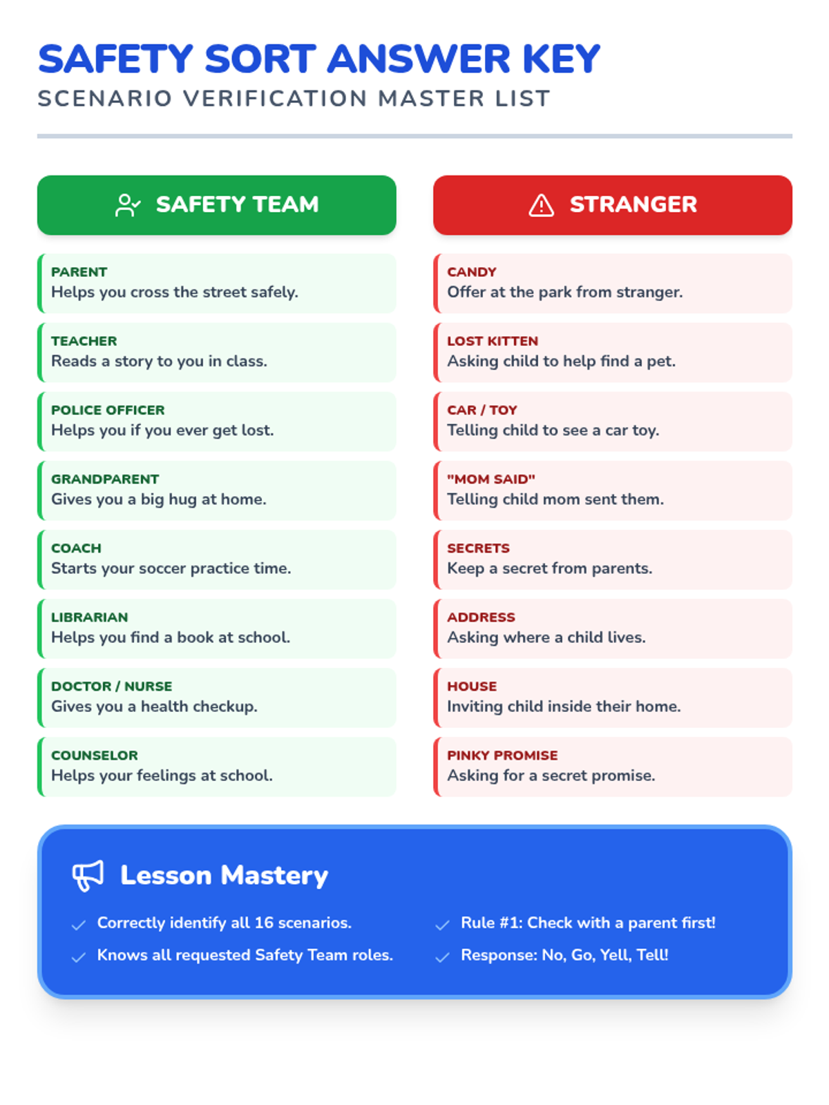 An answer key for teachers to quickly verify the correct sorting of the safety scenarios. It includes brief explanations for the "Stranger Danger" warnings.