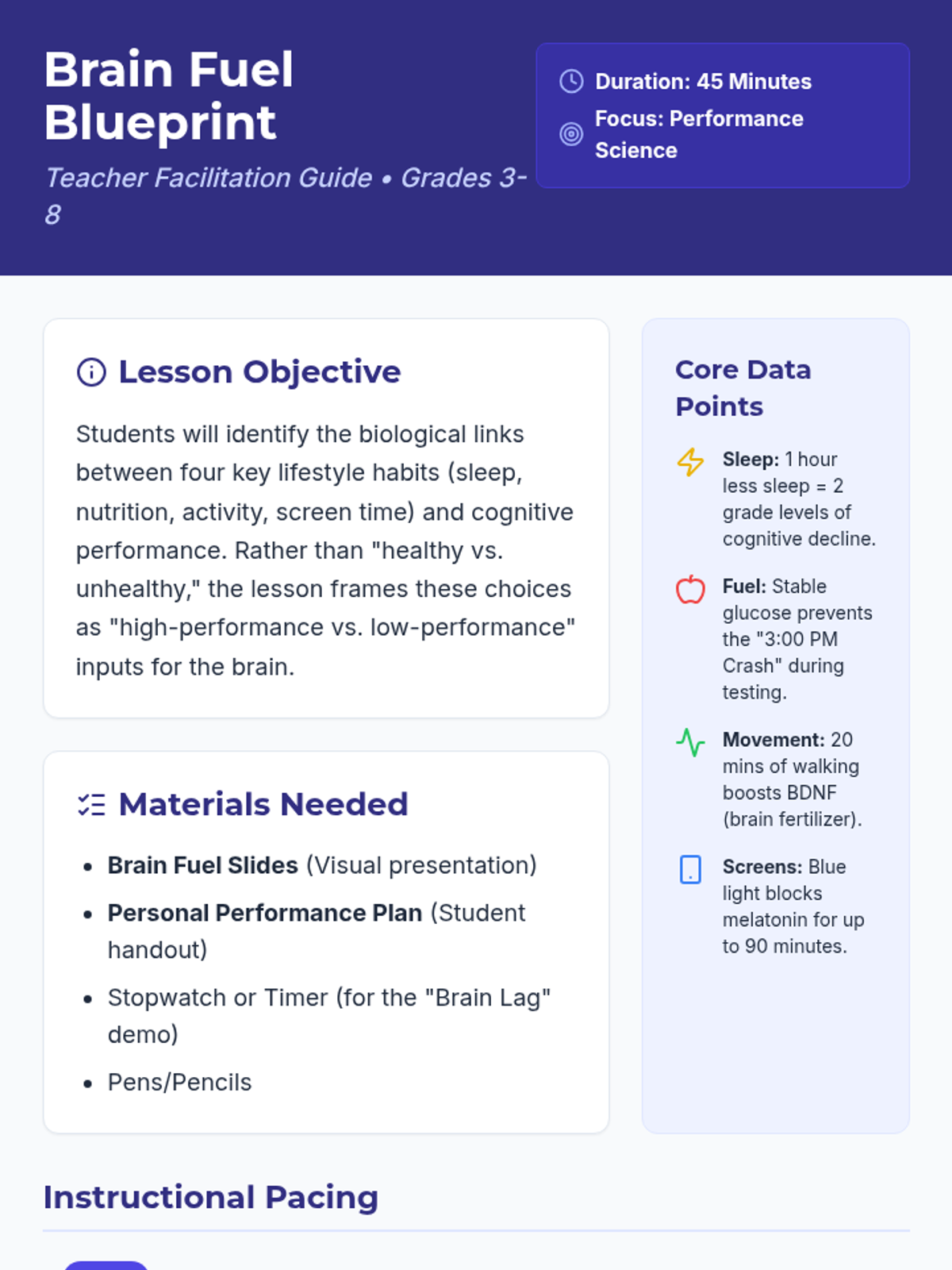 A comprehensive teacher facilitation guide for the Brain Fuel Blueprint lesson, featuring a 45-minute instructional sequence, performance-based framing strategies, and core data points for grades 3-8.