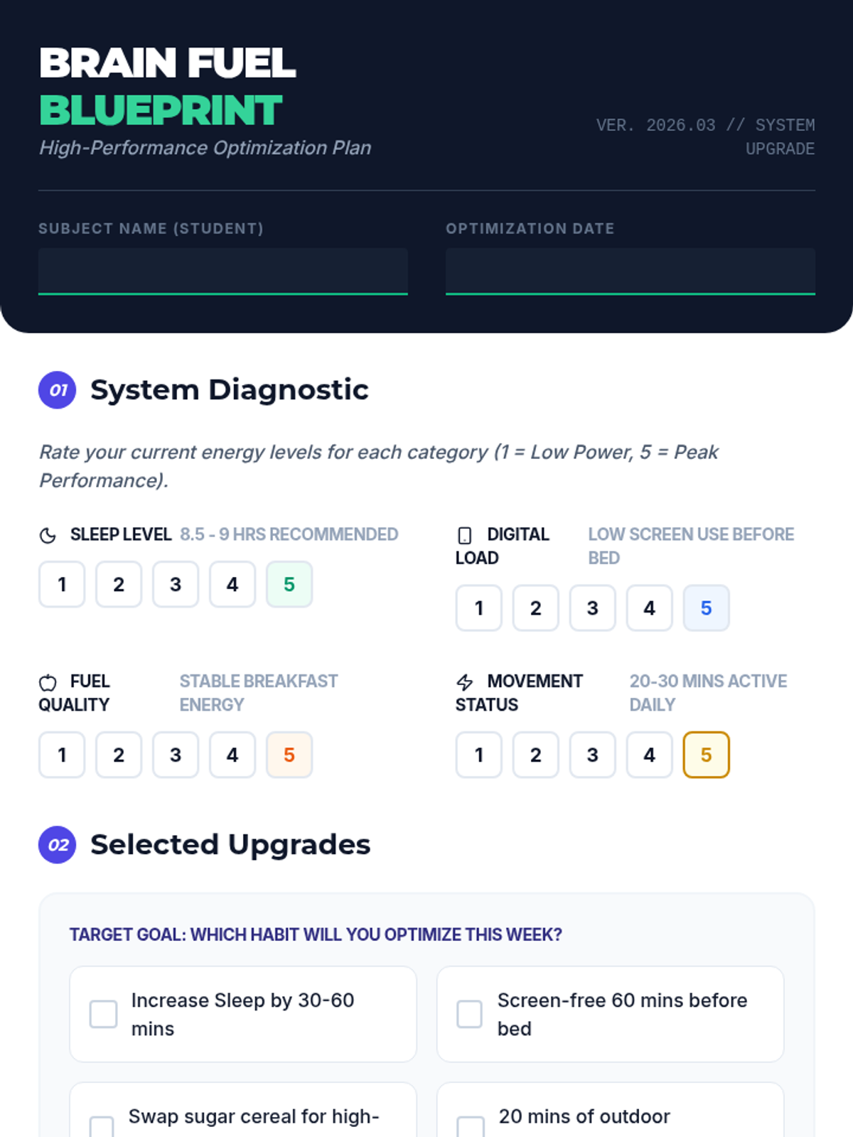 A personal wellness planning document for students to self-assess their habits and commit to specific 'brain upgrades' to improve their academic and cognitive performance.