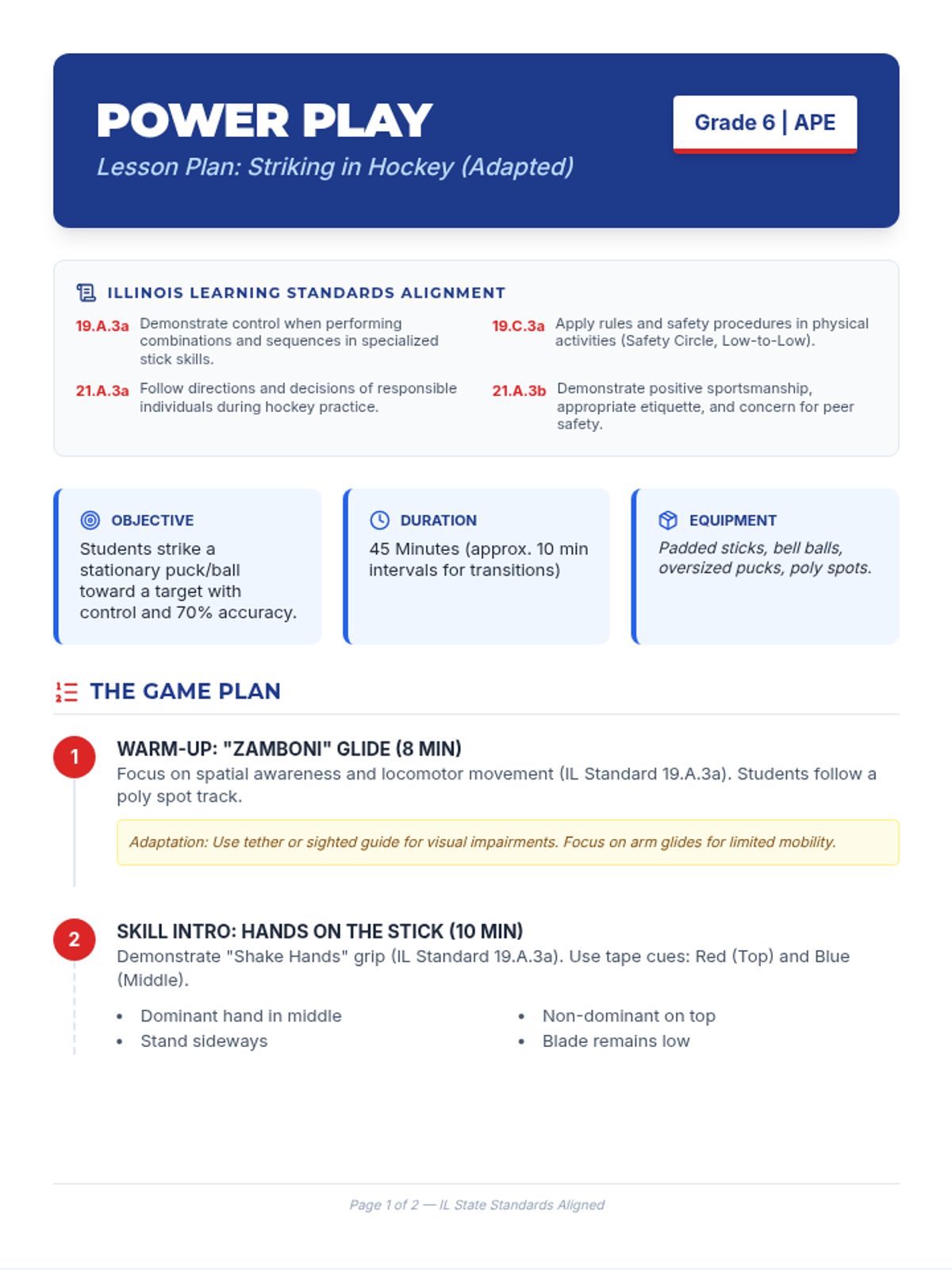 A comprehensive 2-page adapted PE lesson plan for 6th-grade students focusing on hockey striking skills, now explicitly aligned with Illinois Physical Development and Health Standards. Includes modifications for various disabilities and equipment needs.