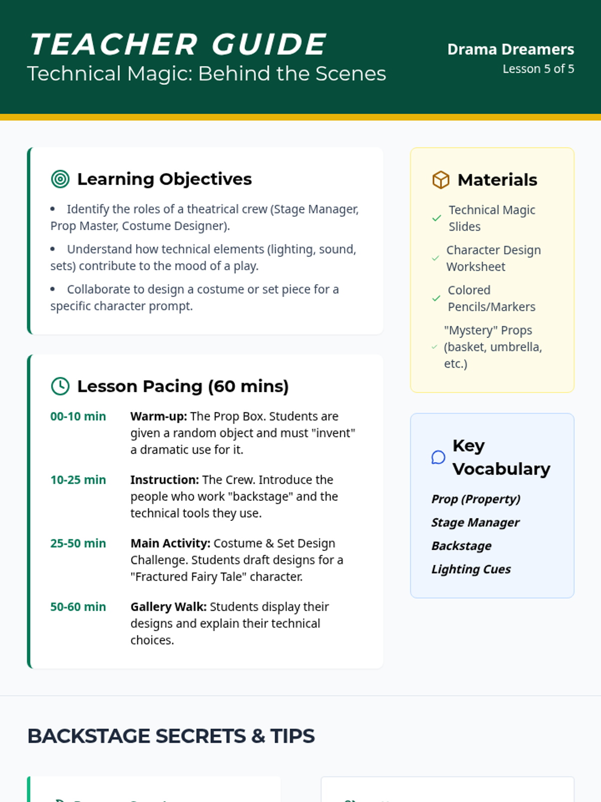A comprehensive teacher guide for Lesson 1, including learning objectives, a timed lesson plan, vocabulary, and differentiation strategies for grades 1-5. Revised with extra discussion questions and improved header contrast.