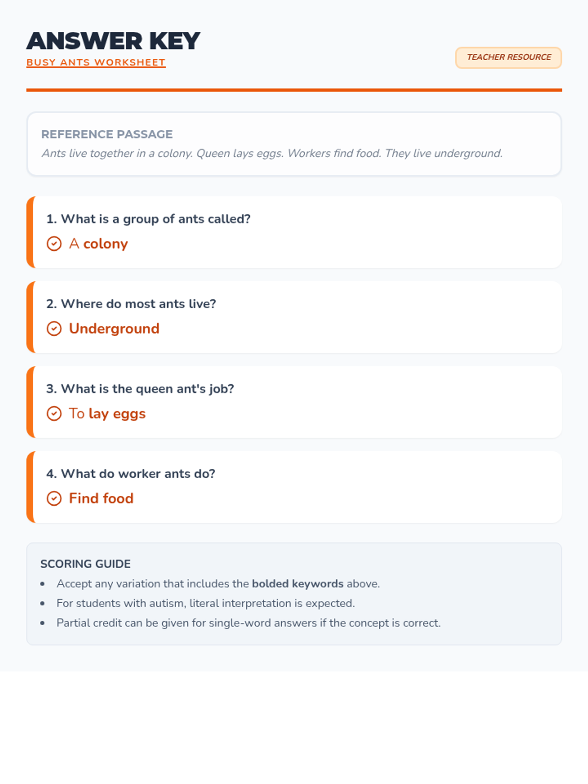 A teacher's answer key for the Busy Ants reading comprehension worksheet, providing correct answers and basic scoring guidance.