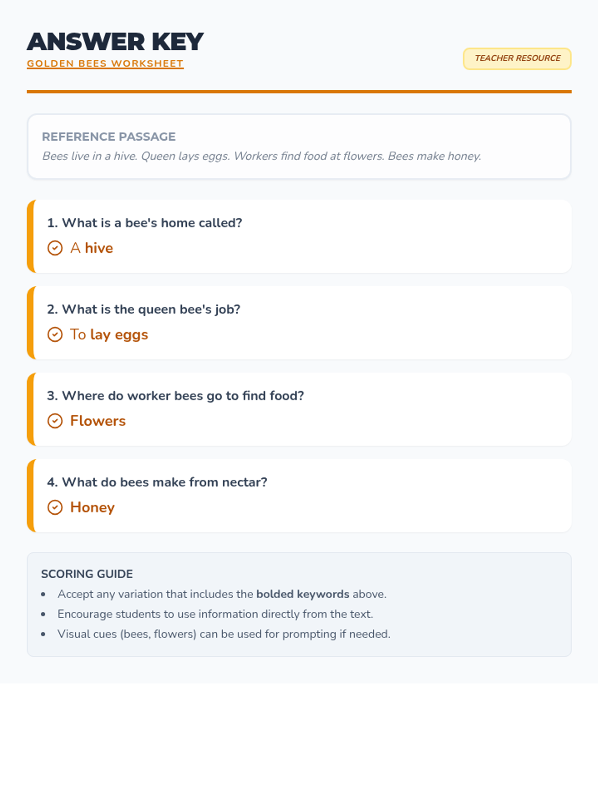 A teacher's answer key for the Golden Bees reading comprehension worksheet, providing correct answers and basic scoring guidance.
