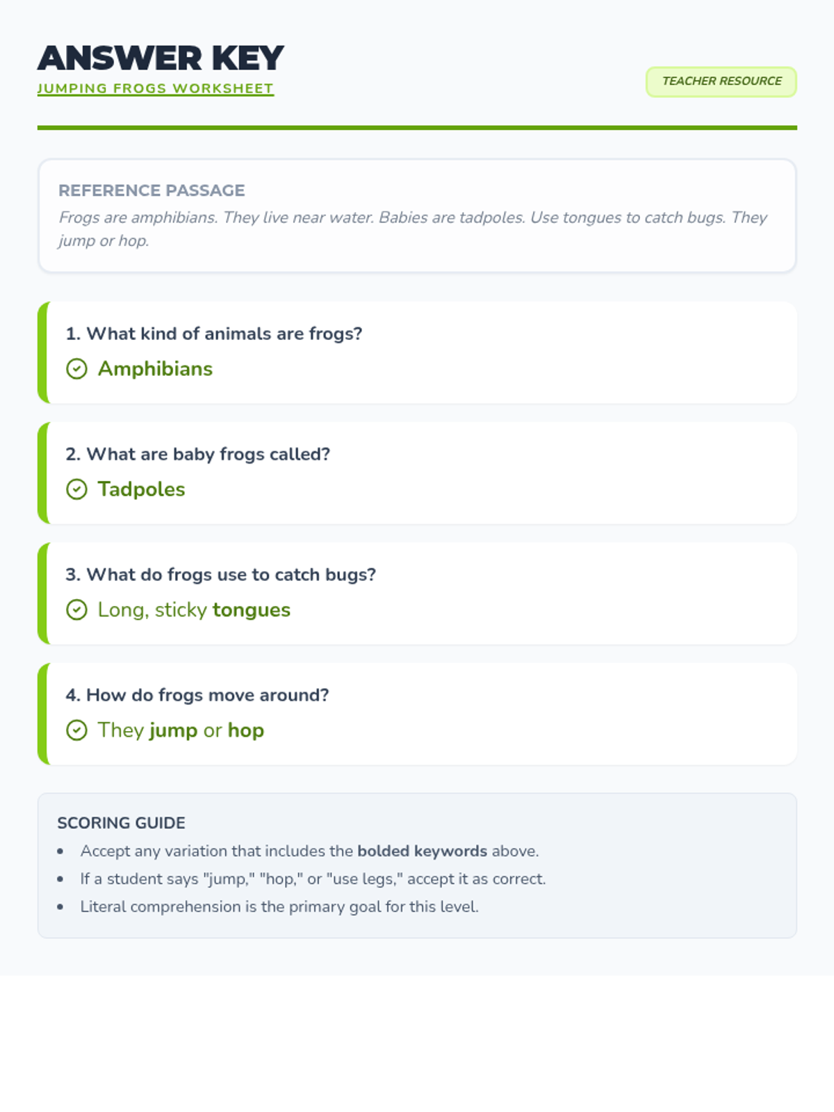 A teacher's answer key for the Jumping Frogs reading comprehension worksheet, providing correct answers and basic scoring guidance.