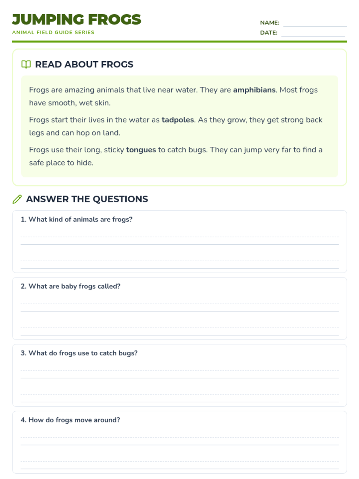 A non-fiction reading comprehension worksheet about frogs, featuring a short passage and four literal short-answer questions with double-spaced writing lines. Designed for single-page printing.