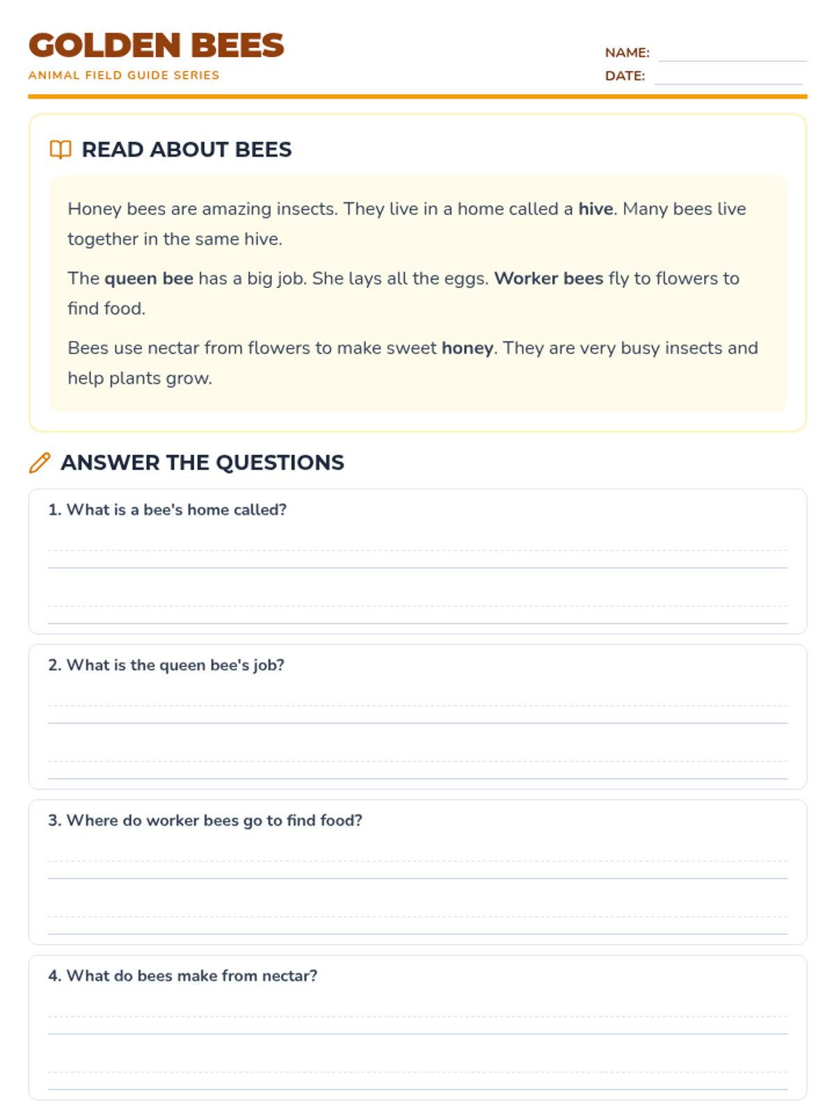 A non-fiction reading comprehension worksheet about honey bees, featuring a short passage and four literal short-answer questions with double-spaced writing lines. Designed for single-page printing.