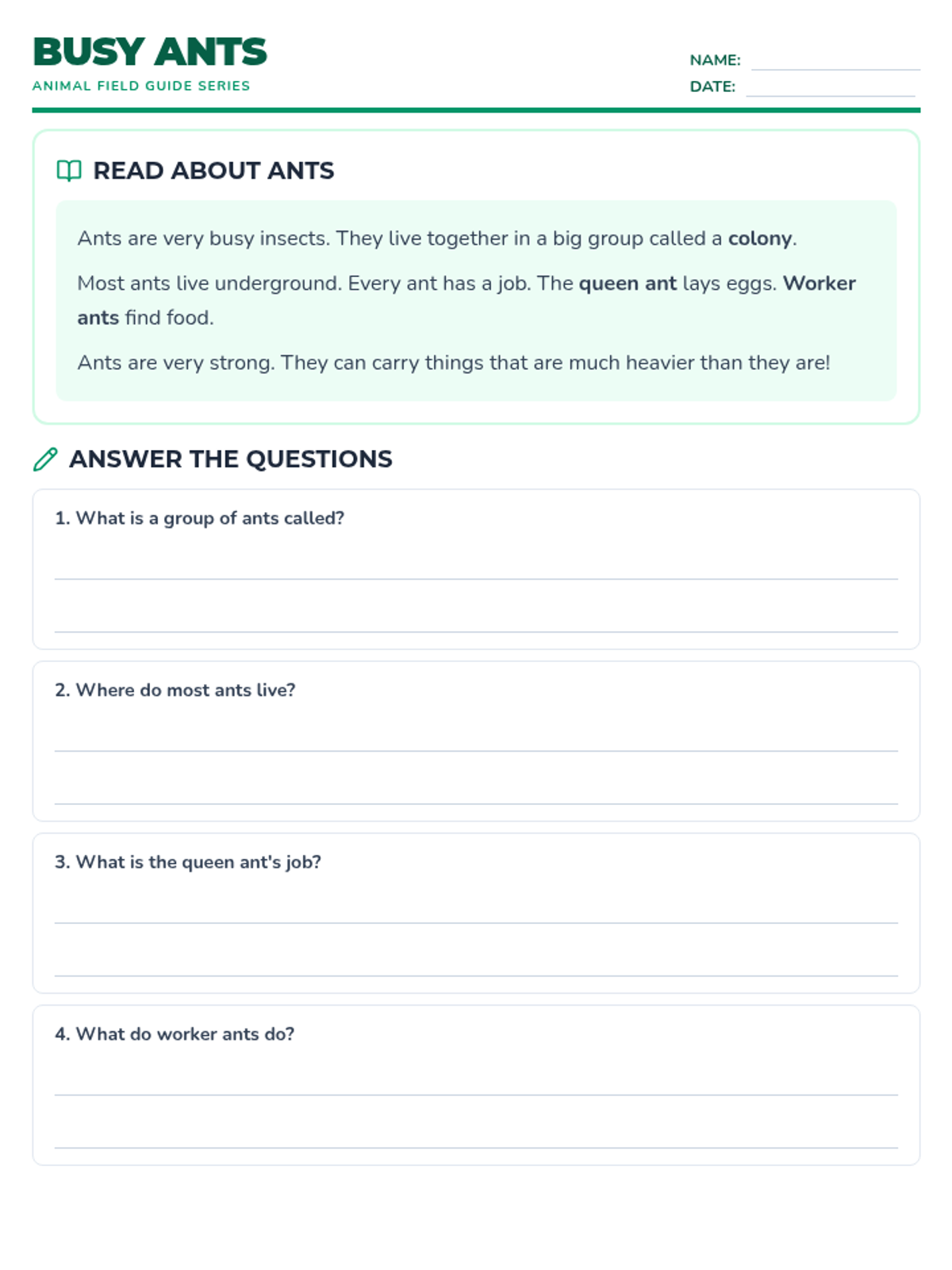 A non-fiction reading comprehension worksheet about ants, featuring a short passage and four literal short-answer questions with clear, double-spaced writing lines. Updated for single-page printing.
