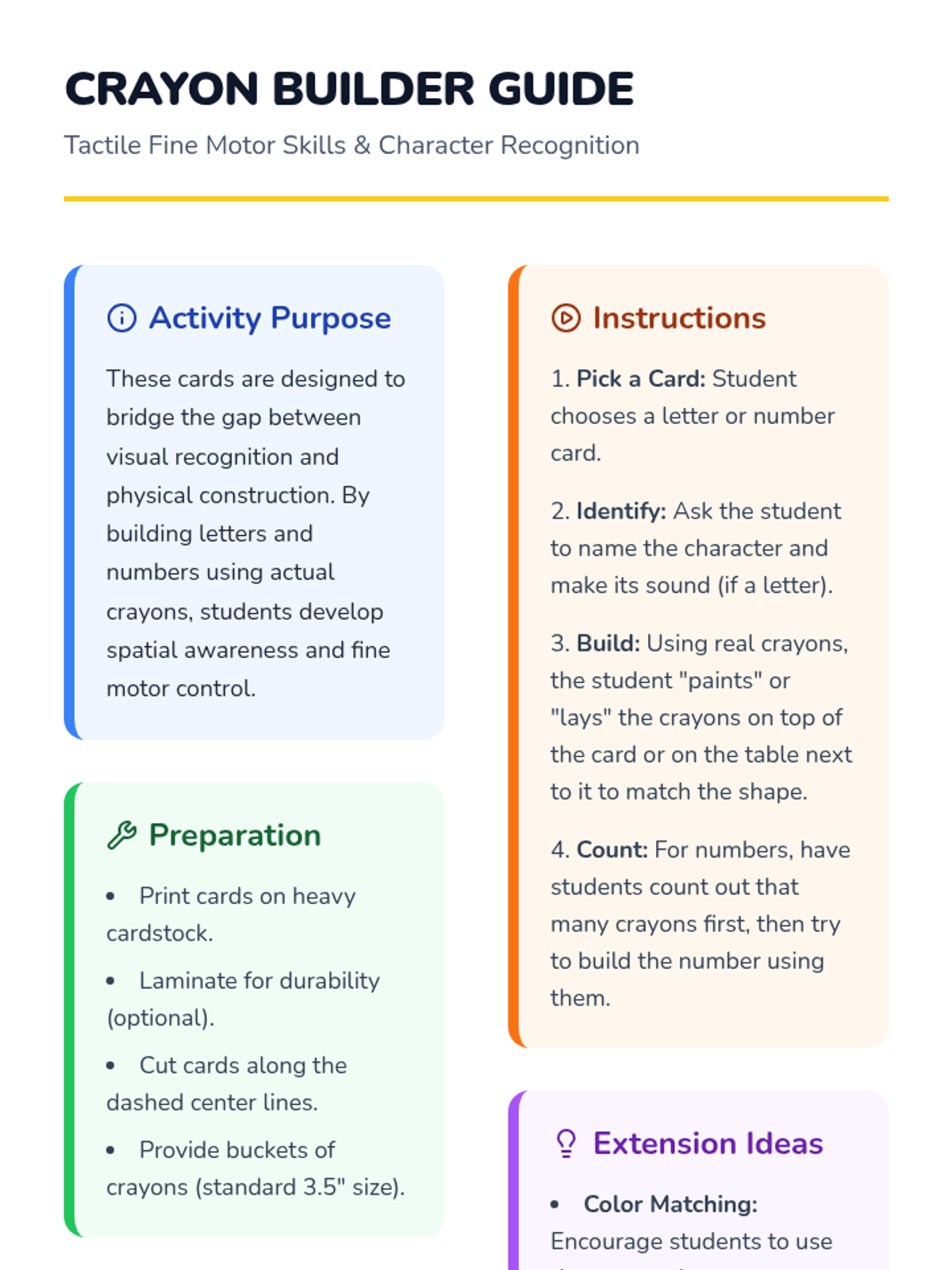 A facilitation guide for teachers outlining the purpose, preparation, and step-by-step instructions for using the crayon building task cards in the classroom.