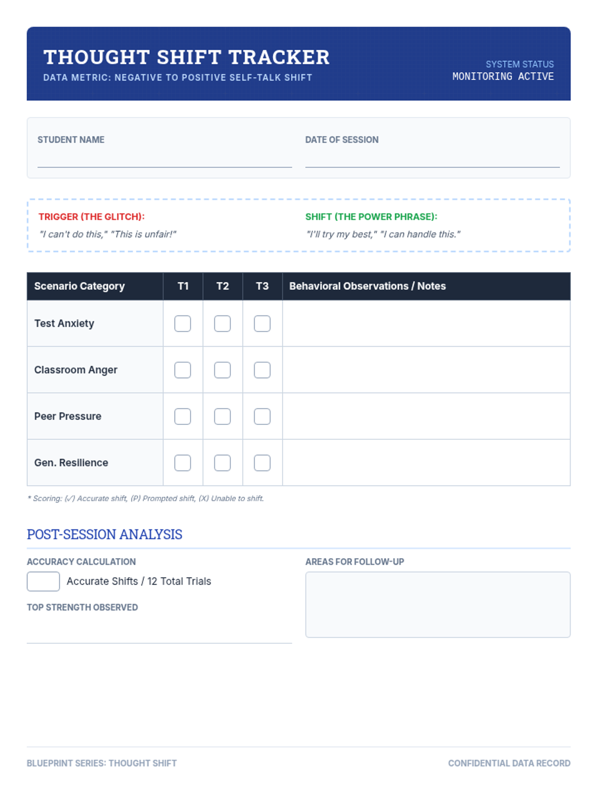 A data tracking sheet designed for social workers to monitor a student's progress in shifting from negative self-talk to positive coping thoughts. It includes specific sections for different anxiety/anger triggers and a scoring system for accuracy.