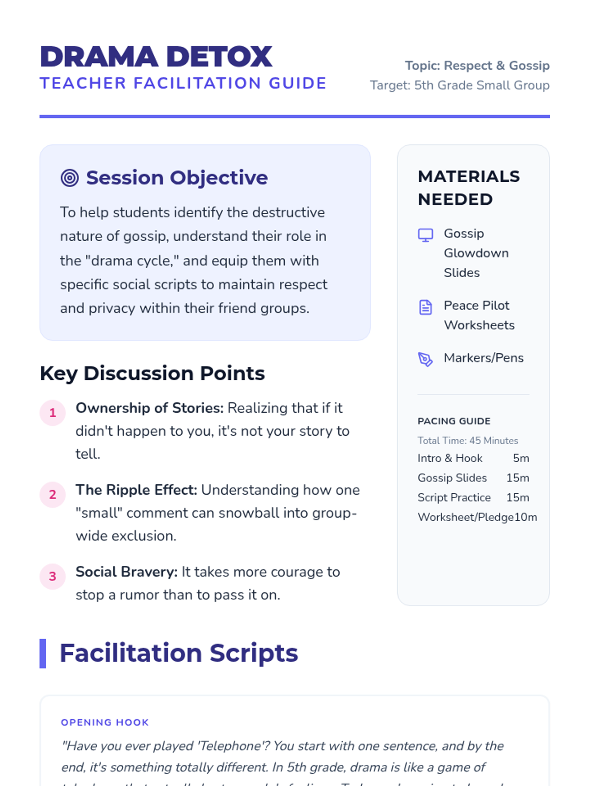 A comprehensive facilitation guide for teachers leading a small-group session on respect and gossip. Includes learning objectives, pacing suggestions, discussion scripts, and strategies for handling common student pushback.