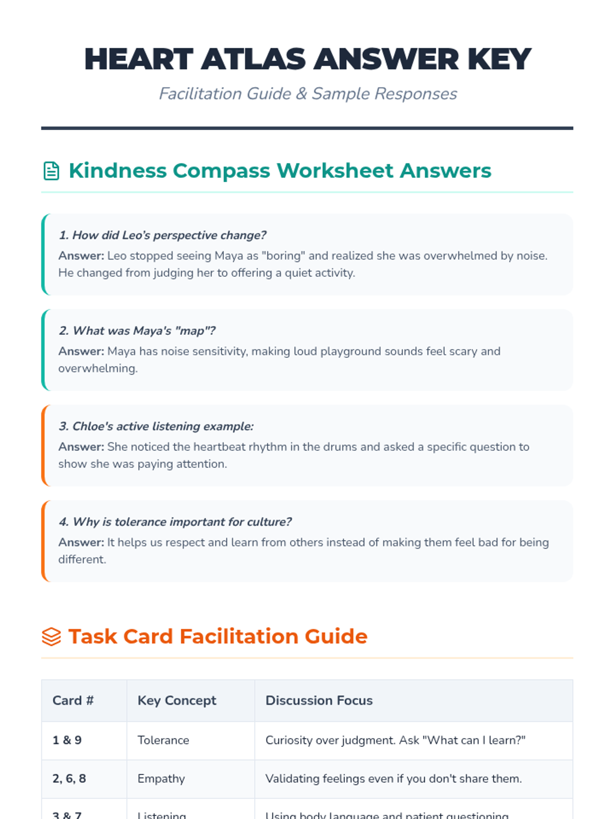 An educator's guide and answer key for the Heart Atlas materials, providing sample student responses and facilitation tips for classroom discussions.