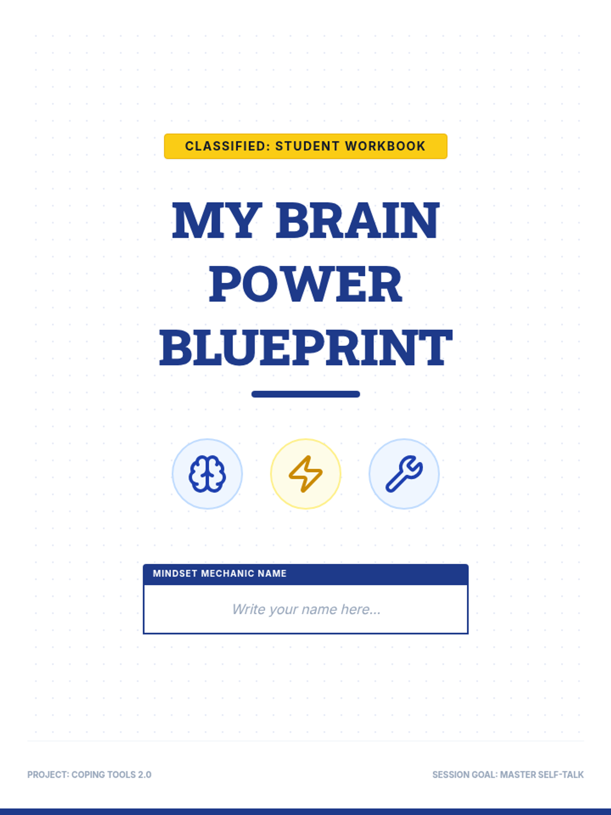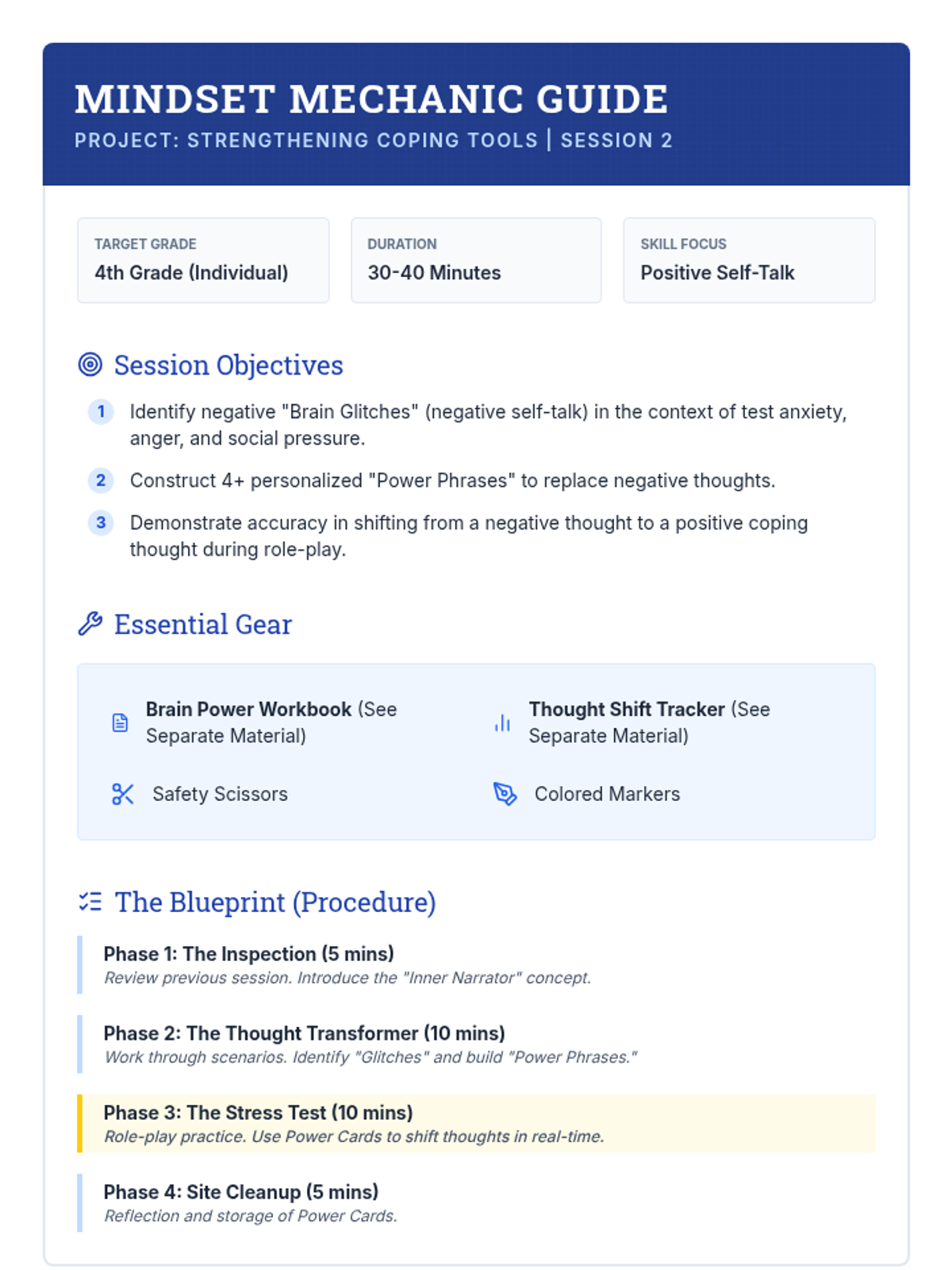 A 4-page student workbook designed for a 25-minute individual social work session. It includes activities to identify "glitch" thoughts and transform them into personalized "power phrases," along with cut-out self-talk cards and reflection prompts.